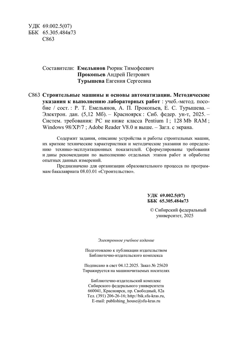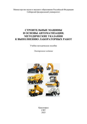 Библиографическое описание: Строительные машины и основы автоматизации. Методические указания к выполнению лабораторных работ : учебно-методическое пособие / Сибирский федеральный университет, Инженерно-строительный институт ; сост.: Р. Т. Емельянов, А. П. Прокопьев, Е. С. Турышева. - Электрон. текстовые дан. (pdf, 5.2 Мб). - Красноярск : СФУ, 2025 (2025-12-04). - 153 с. : ил., цв. ил., табл. - Загл. с титул. экрана. - Библиогр.: с. 148. - Изд. № 2025-25620 : Б. ц. - Текст : электронный.
