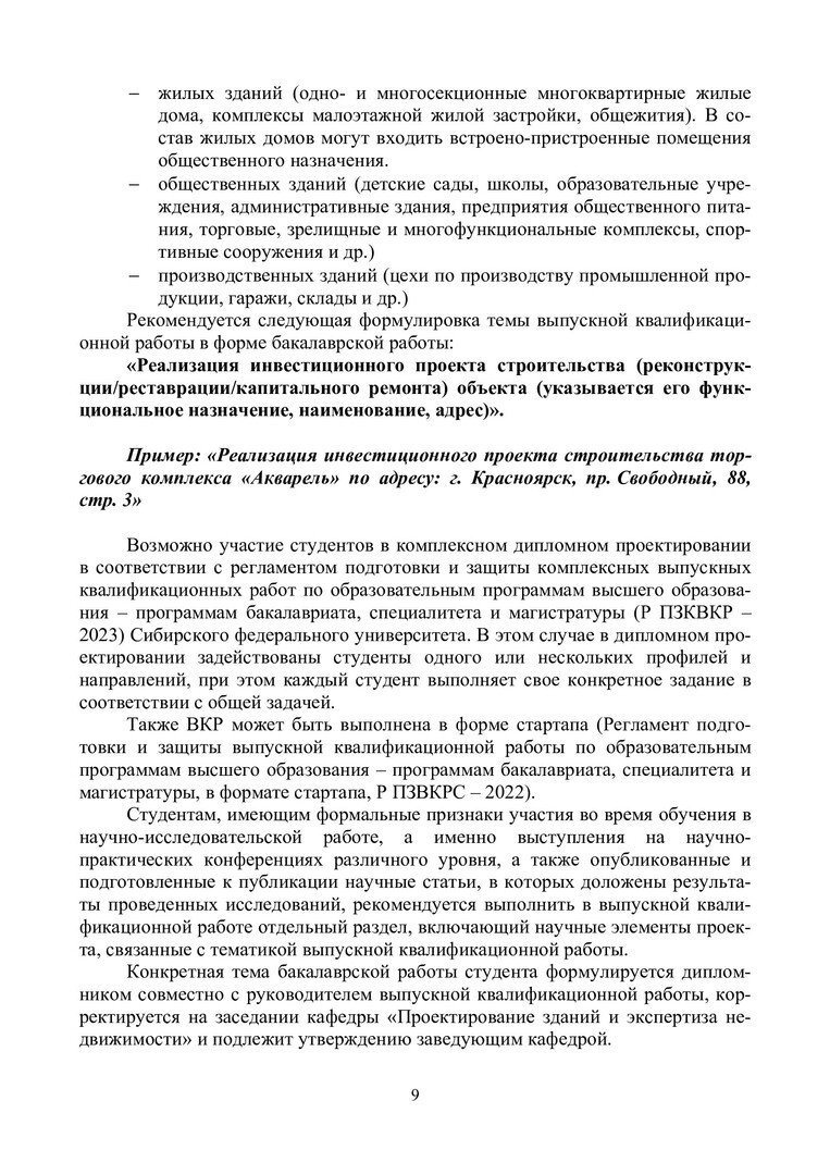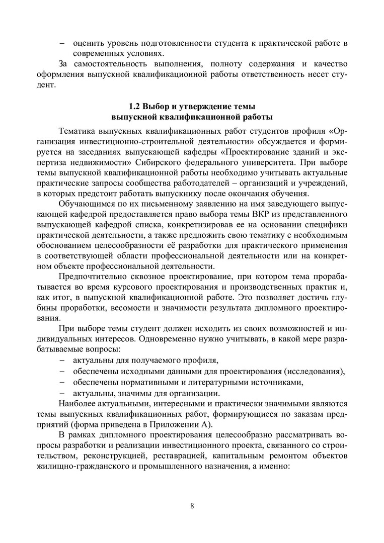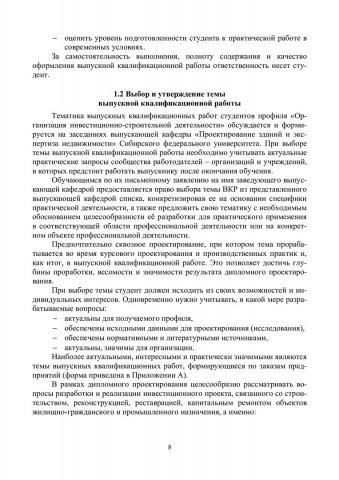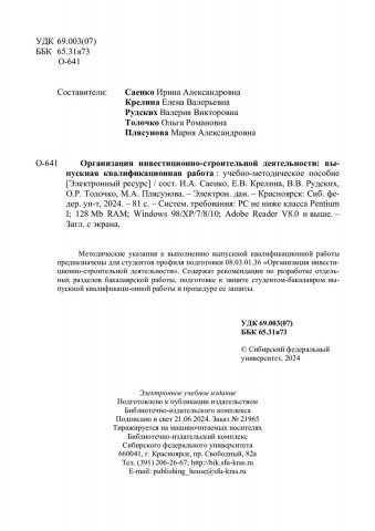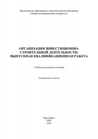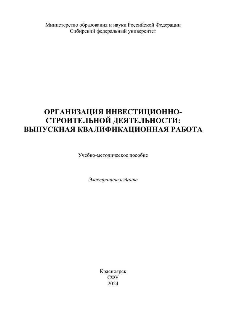 Библиографическое описание:Организация инвестиционно-строительной деятельности: выпускная квалификационная работа : учебно-методическое пособие / Сибирский федеральный университет, Инженерно-строительный институт ; сост.: И. А. Саенко, Е. В. Крелина, В. В. Рудских [и др.]. - Электрон. текстовые дан. (pdf, 0,8 Мб). - Красноярск : СФУ, 2024. - 81 с. - Загл. с титул. экрана. - Изд. № 2024-21965 : Б. ц. - Текст : электронный.