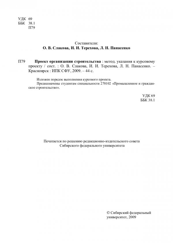 Библиографическое описание:Проект организации строительства : метод. указания к курсовому проекту / Сиб. федер. ун-т, Инж.-строит. ин-т ; сост.: О. В. Слакова, И. И. Терехова, Л. Н. Панасенко. - Красноярск : ИПК СФУ, 2009. - 44 с. : табл.