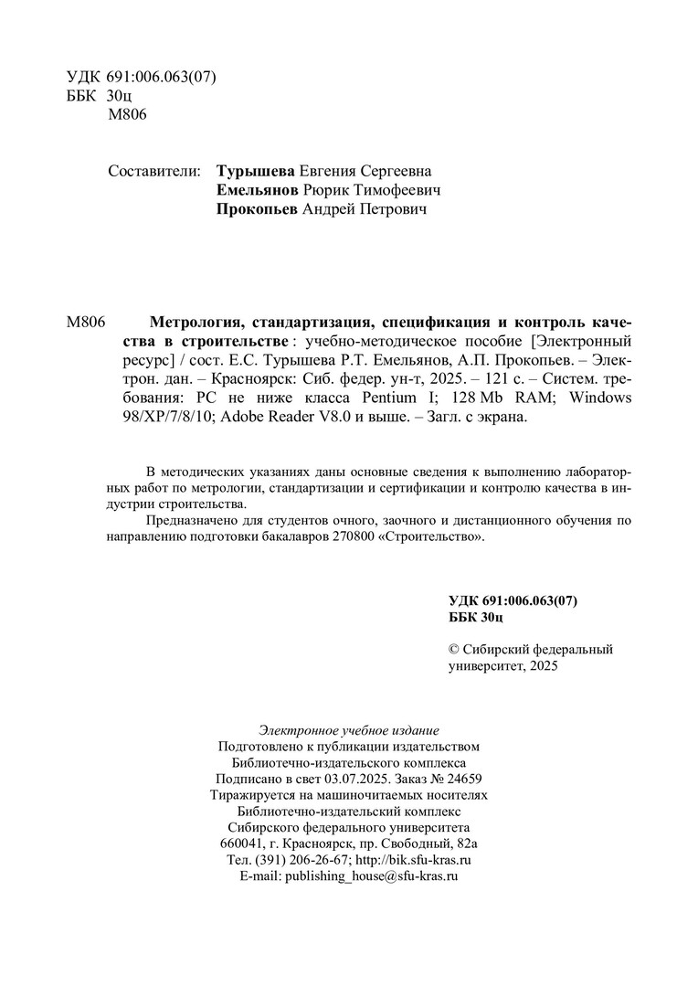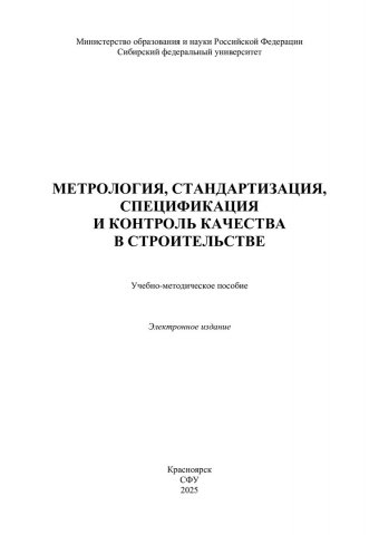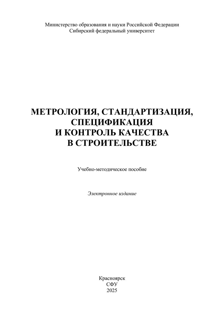 Библиографическое описание:Метрология, стандартизация, спецификация и контроль качества в строительстве : учебно-методическое пособие / Сибирский федеральный университет, Инженерно-строительный институт ; сост.: Е. С. Турышева, Р. Т. Емельянов, А. П. Прокопьев. - Электрон. текстовые дан. (pdf, 2,9 Мб). - Красноярск : СФУ, 2025. - 121 с. - Загл. с титул. экрана. - Библиогр.: с. 100. - Изд. № 2025-24659 : Б. ц. - Текст : электронный.