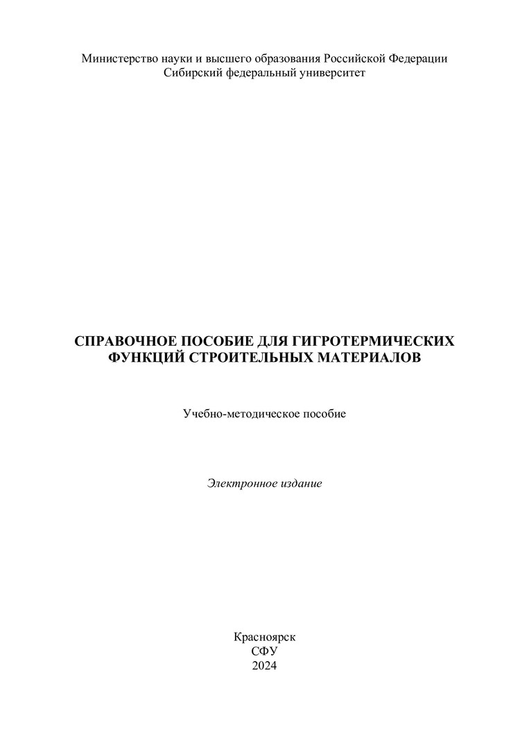 Библиографическое описание: Справочное пособие для гигротермических функций строительных материалов : учебно-методическое пособие / Сибирский федеральный университет, Инженерно-строительный институт ; сост.: С. А. Алиев, Р. А. Назиров, И. В. Тарасов. - Электрон. текстовые дан. (pdf, 1,4 Мб). - Красноярск : СФУ, 2024 (2024-12-27). - 46 с. - Загл. с титул. экрана. - Библиогр.: с. 44. - Изд. № 2024-23280 : Б. ц. - Текст : электронный.