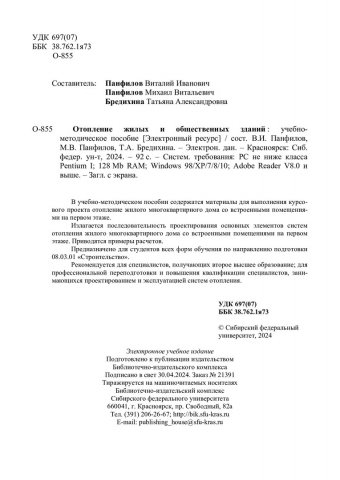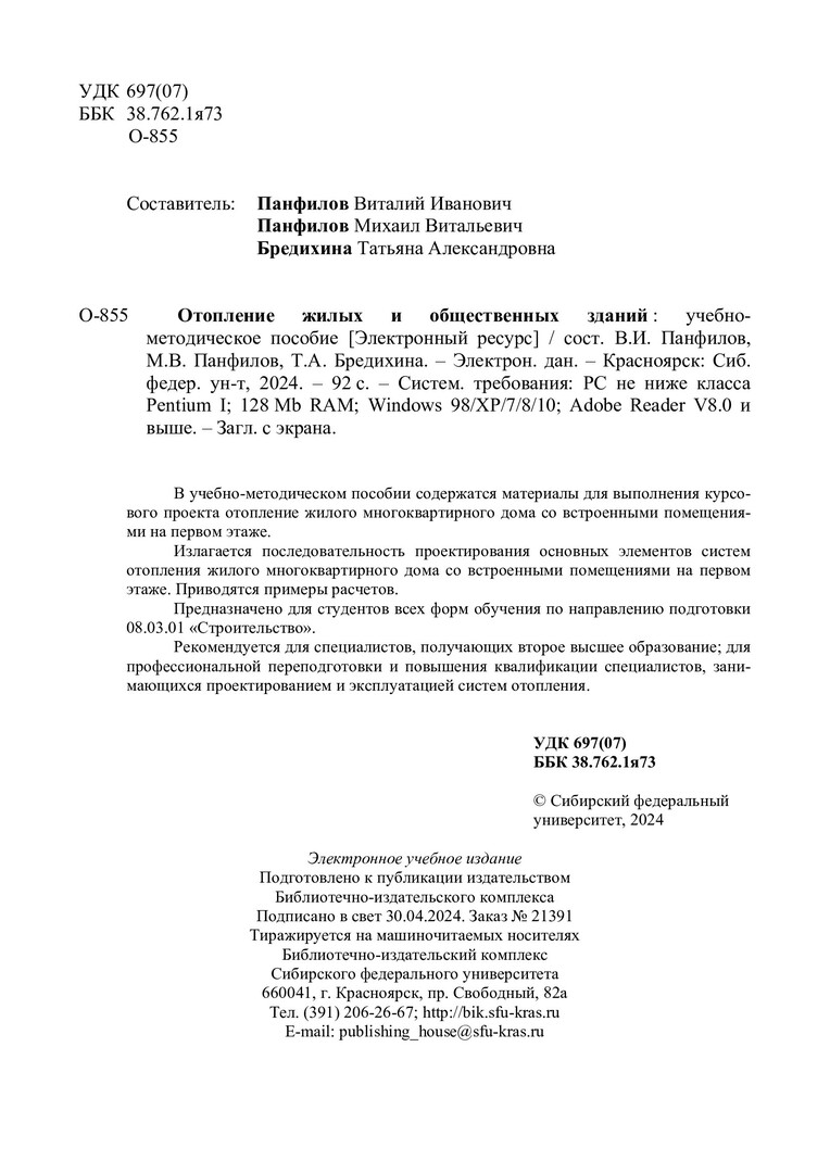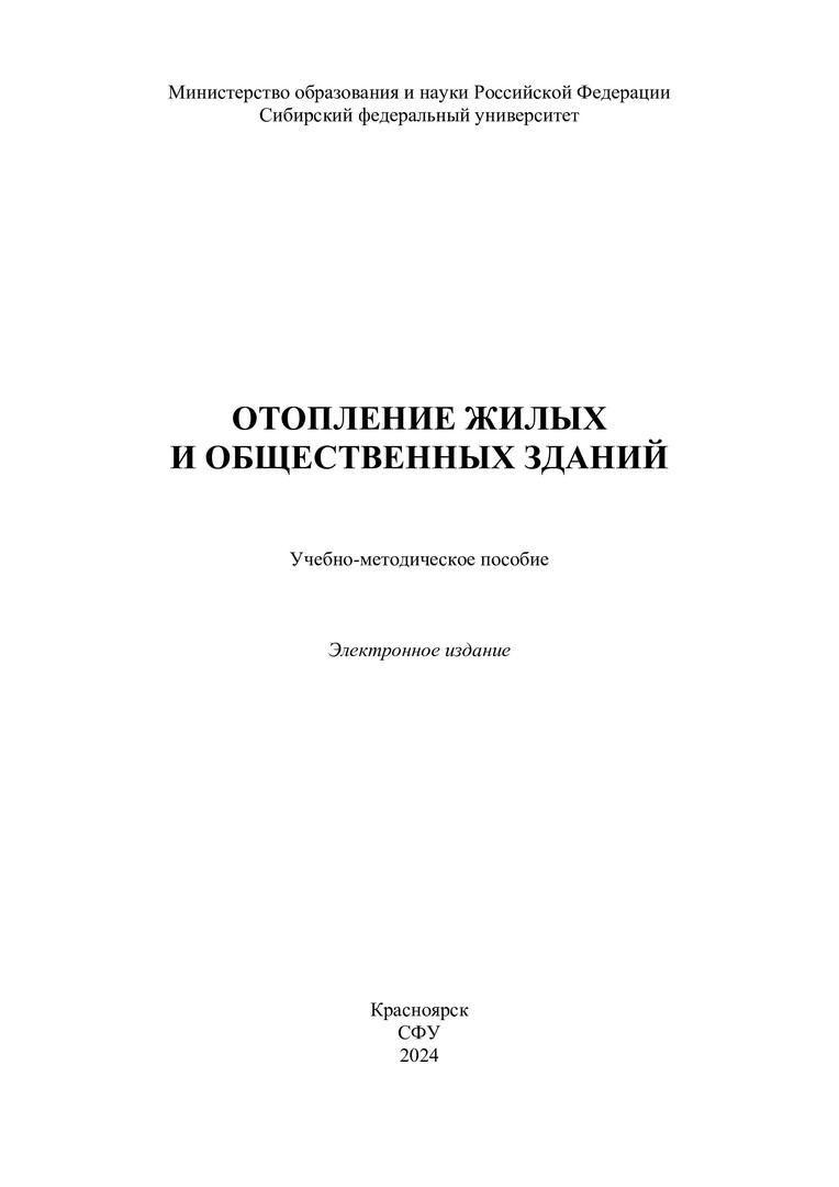 Библиографическое описание: Отопление жилых и общественных зданий : учебно-методическое пособие / Сиб. федер. ун-т, Инж.-строит. ин-т ; сост.: В. И. Панфилов, М. В. Панфилов, Т. А. Бредихина. - Электрон. текстовые дан. (pdf, 5,5 Мб). - Красноярск : СФУ, 2024. - 92 с. - Загл. с титул. экрана. - Изд. № 2024-21391 : Б. ц. - Текст : электронный.