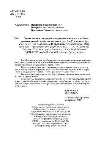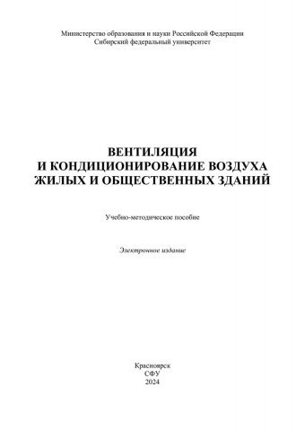 Библиографическое описание: Вентиляция и кондиционирование воздуха жилых и общественных зданий : учебно-методическое пособие / Сиб. федер. ун-т, Инж.-строит. ин-т ; сост.: В. И. Панфилов, М. В. Панфилов, Т. А. Бредихина. - Электрон. текстовые дан. (pdf, 5,1 Мб). - Красноярск : СФУ, 2024. - 71 с. - Загл. с титул. экрана. - Изд. № 2024-21465 : Б. ц. - Текст : электронный.