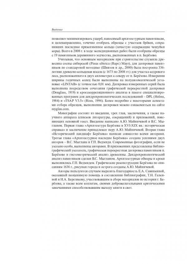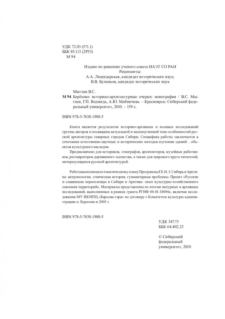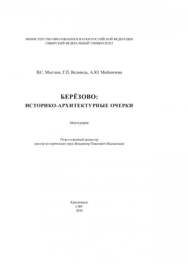 Библиографическое описание: Мыглан, Владимир Станиславович. Берёзово: историко-архитектурные очерки : монография / В. С. Мыглан, Г. П. Ведмидь, А. Ю. Майничева ; рец.: А. А. Люцидарская, В. В. Буланков ; Сибирский федеральный университет. - Красноярск : ИПК СФУ, 2010. - 158 с. : цв. ил., ил. - (Библиотека журнала СФУ). - Библиогр.: с. 139-153. - ISBN 978-5-7638-1988-5. - Текст : непосредственный + Текст : электронный.