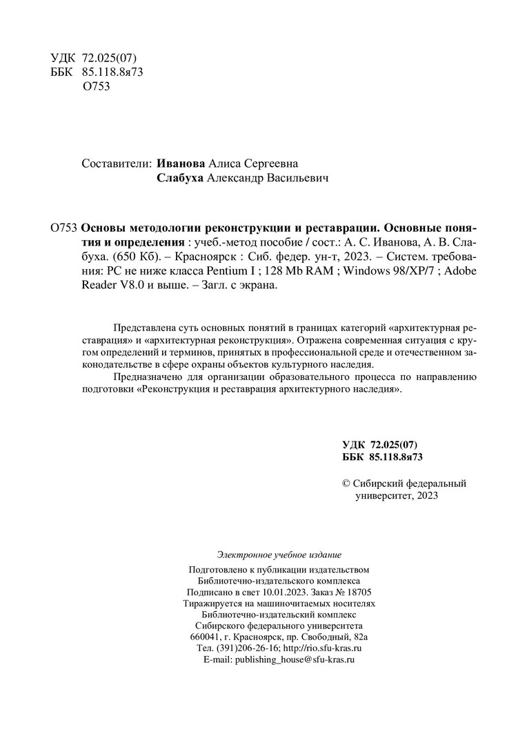 Библиографическое описание:Основы методологии реконструкции и реставрации. Основные понятия и определения : учебно-методическое пособие / Сиб. федер. ун-т, Ин-т архитектуры и дизайна ; сост.: А. С. Иванова, А. В. Слабуха. - Электрон. текстовые дан. (pdf, 0,8 Мб). - Красноярск : СФУ, 2023 (2023-04-10). - 13 с. - Загл. с титул. экрана. - Изд. № 2023-10705 : Б. ц. - Текст : электронный.