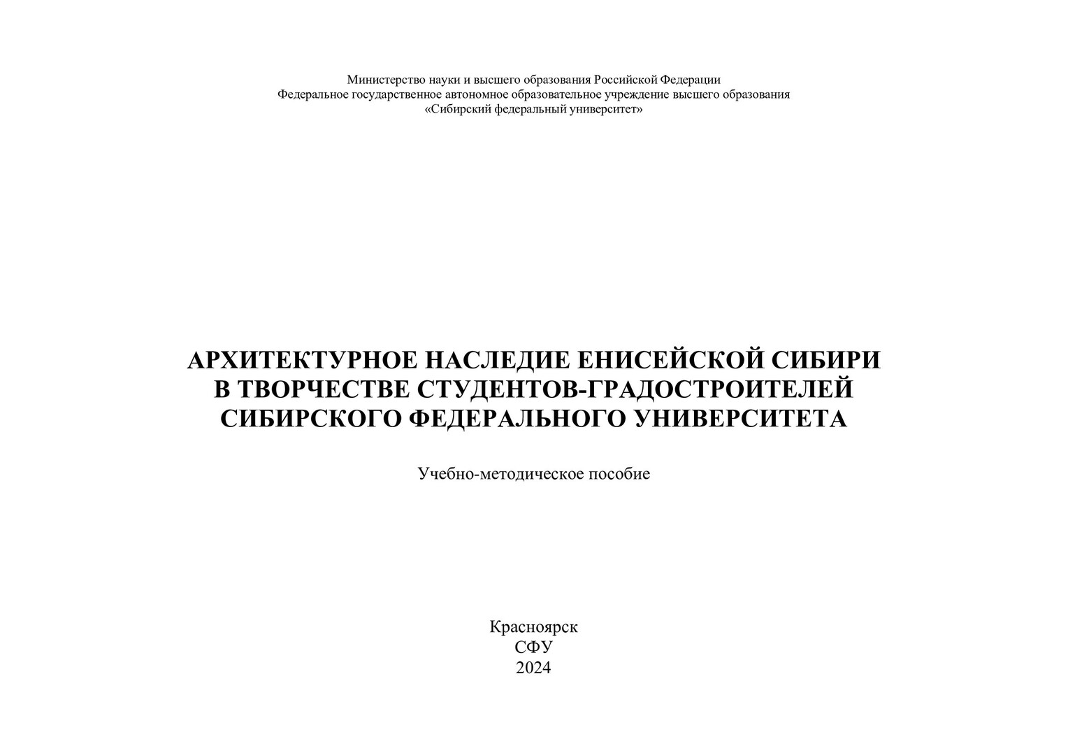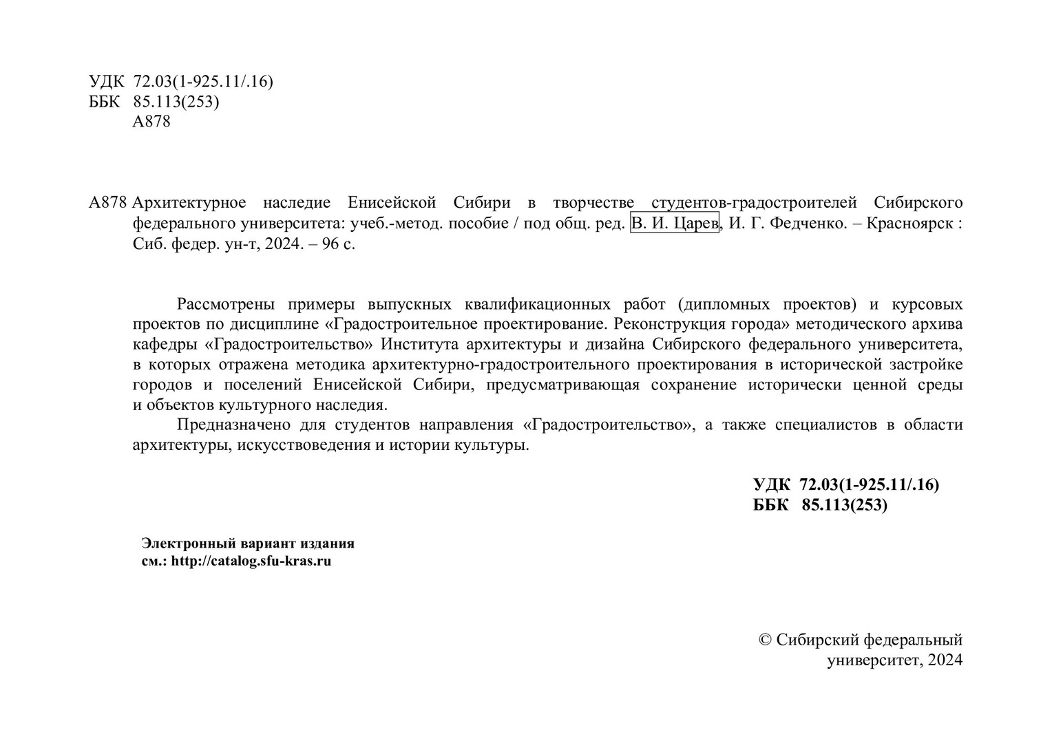 Библиографическое описание: Архитектурное наследие Енисейской Сибири в творчестве студентов-градостроителей Сибирского федерального университета : учебно-методическое пособие / Сибирский федеральный университет, Инженерно-строительный институт ; отв. ред.: В. И. Царев, И. Г. Федченко. - Электрон. текстовые дан. (pdf ; 81,6 Мб). - Красноярск : СФУ, 2024 (2024-10-18). - 96 с. : ил., цв. ил. - Загл. с титул. экрана. - Электрон. версия печ. публикации . - Библиогр.: с. 86-87. - 100 экз. - Изд. № 2024-22104 : Б. ц. - Текст : электронный.