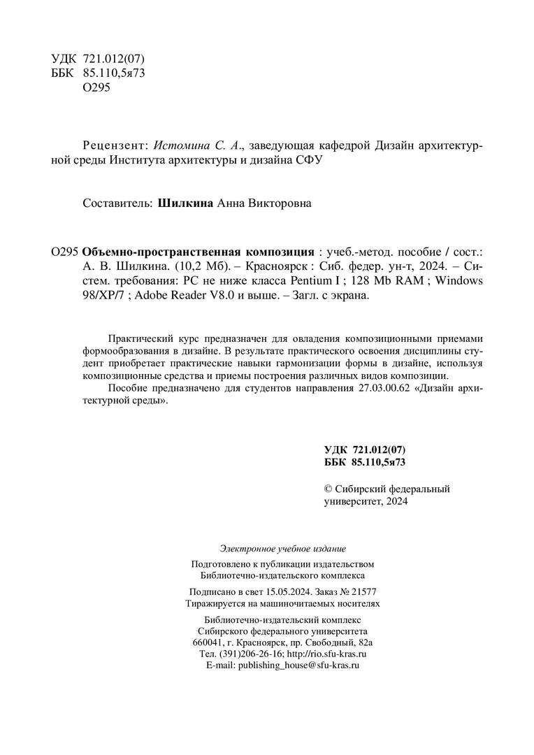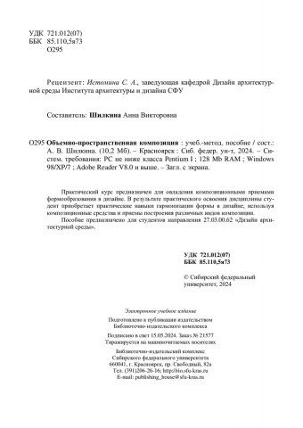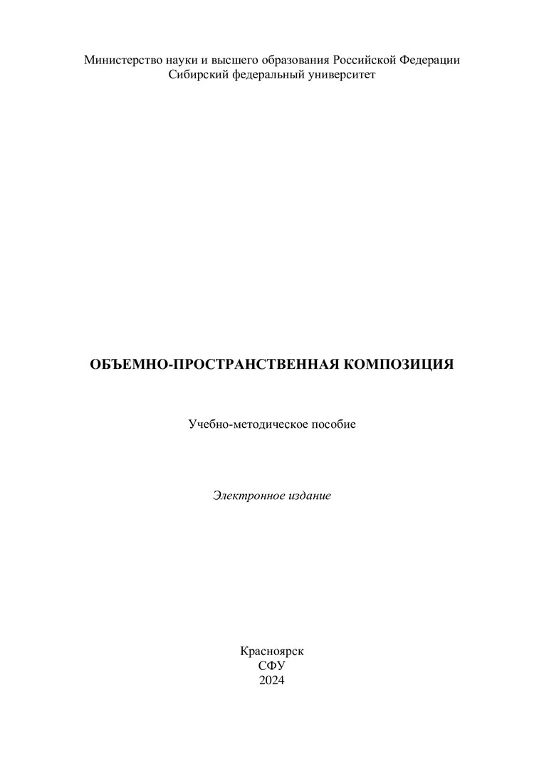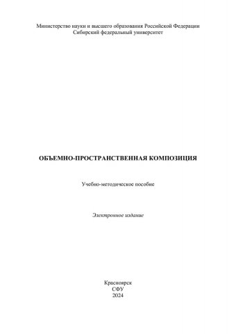 Библиографическое описание:Объемно-пространственная композиция : учебно-методическое пособие / Сиб. федер. ун-т, Ин-т архитектуры и дизайна ; сост. А. В. Шилкина. - Электрон. текстовые дан. (pdf, 18,7 Мб). - Красноярск : СФУ, 2024 (2024-05-15). - 128 с. - Загл. с титул. экрана. - Изд. № 2024-21577 : Б. ц. - Текст : электронный.