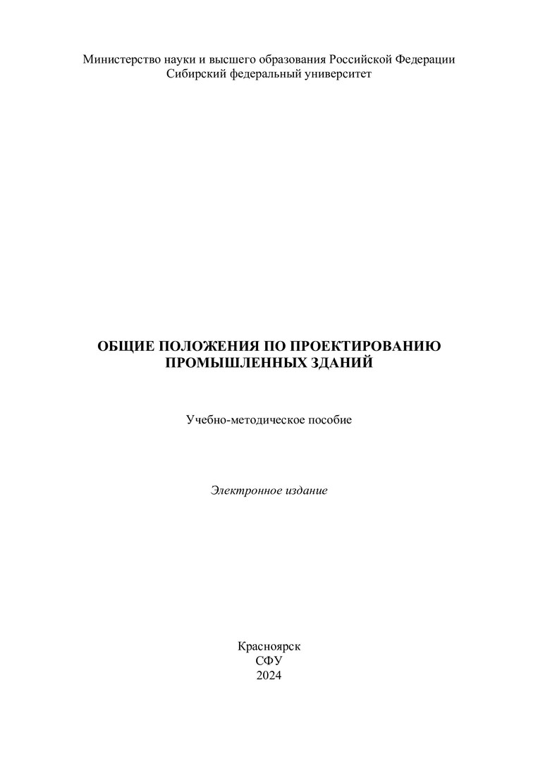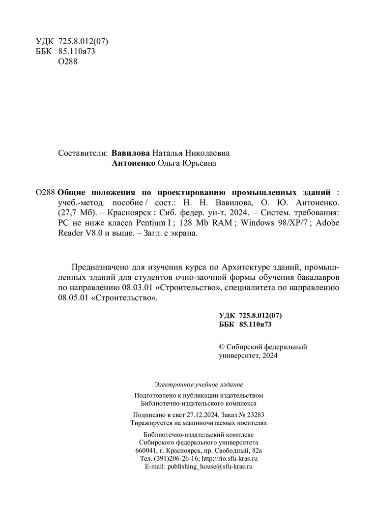 Библиографическое описание: Общие положения по проектированию промышленных зданий : учебно-методическое пособие / Сибирский федеральный университет, Инженерно-строительный институт ; сост.: Н. Н. Вавилова, О. Ю. Антоненко. - Электрон. текстовые дан. (pdf, 26,5 Мб). - Красноярск : СФУ, 2024 (2024-12-27). - 184 с. : ил. - Загл. с титул. экрана. - Библиогр.: с. 181-184. - Изд. № 2024-23283 : Б. ц. - Текст : электронный.