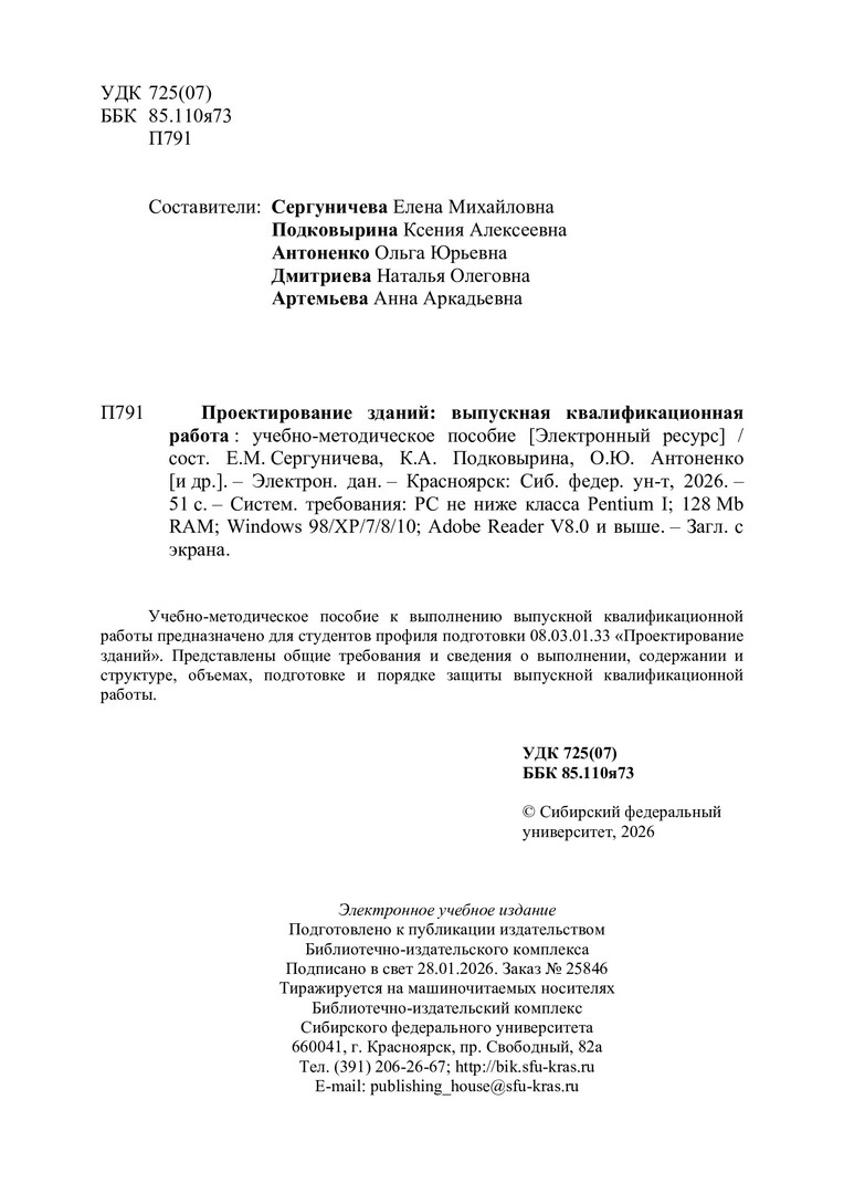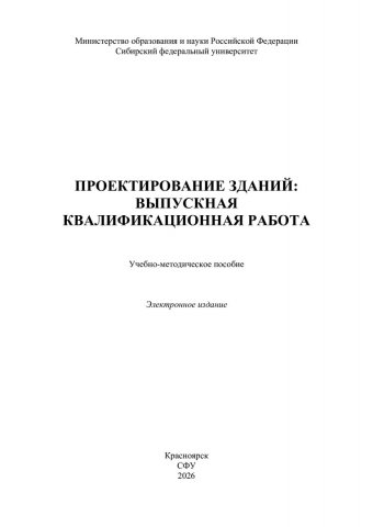 Библиографическое описание: Проектирование зданий: выпускная квалификационная работа : учебно-методическое пособие / Сибирский федеральный университет, Инженерно-строительный институт ; сост. :Е. М. Сергуничева, К. А. Подковырина, О. Ю. Антоненко [и др.]. - Электрон. текстовые дан. (pdf, 0.7 Мб). - Красноярск : СФУ, 2026 (2026-01-28). - 51 с. : табл. - Загл. с титул. экрана. - Библиогр.: с. 42-43. - Изд. № 2025-25846 : Б. ц. - Текст : электронный.