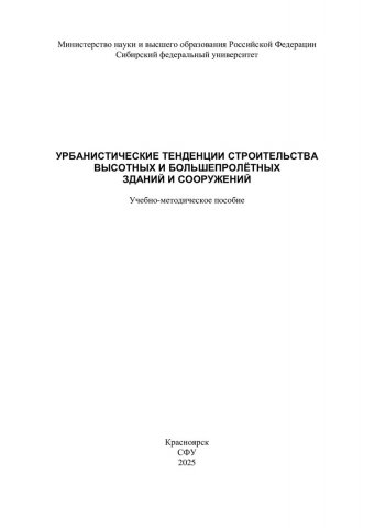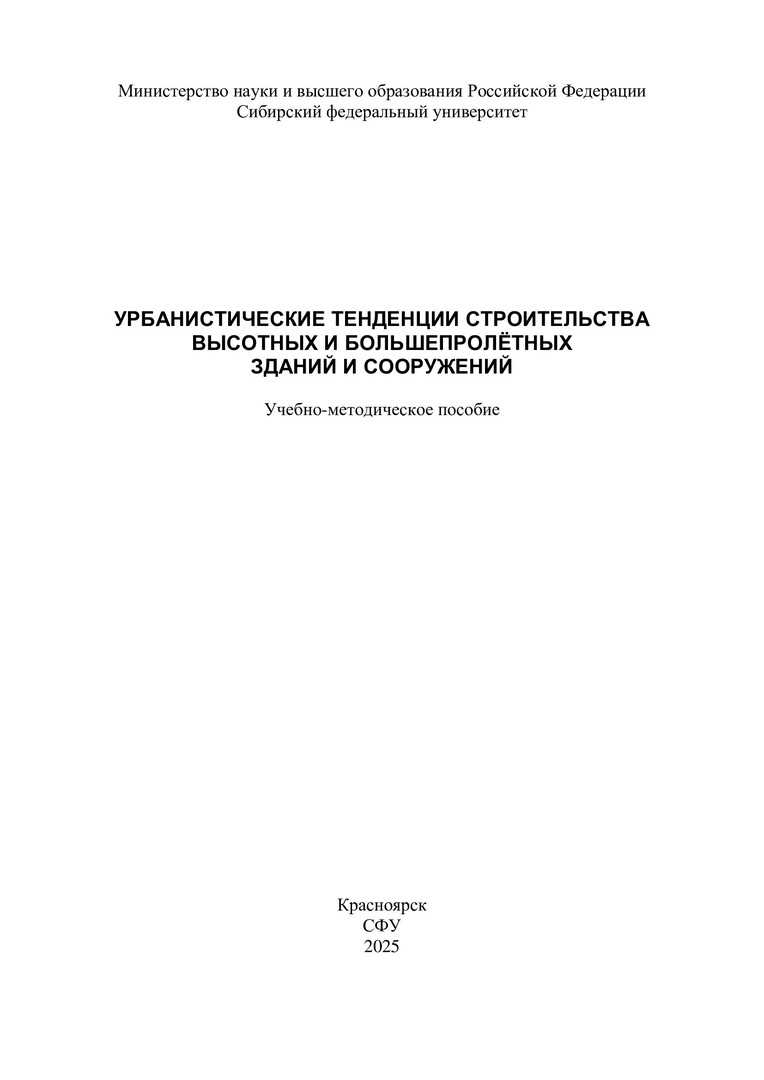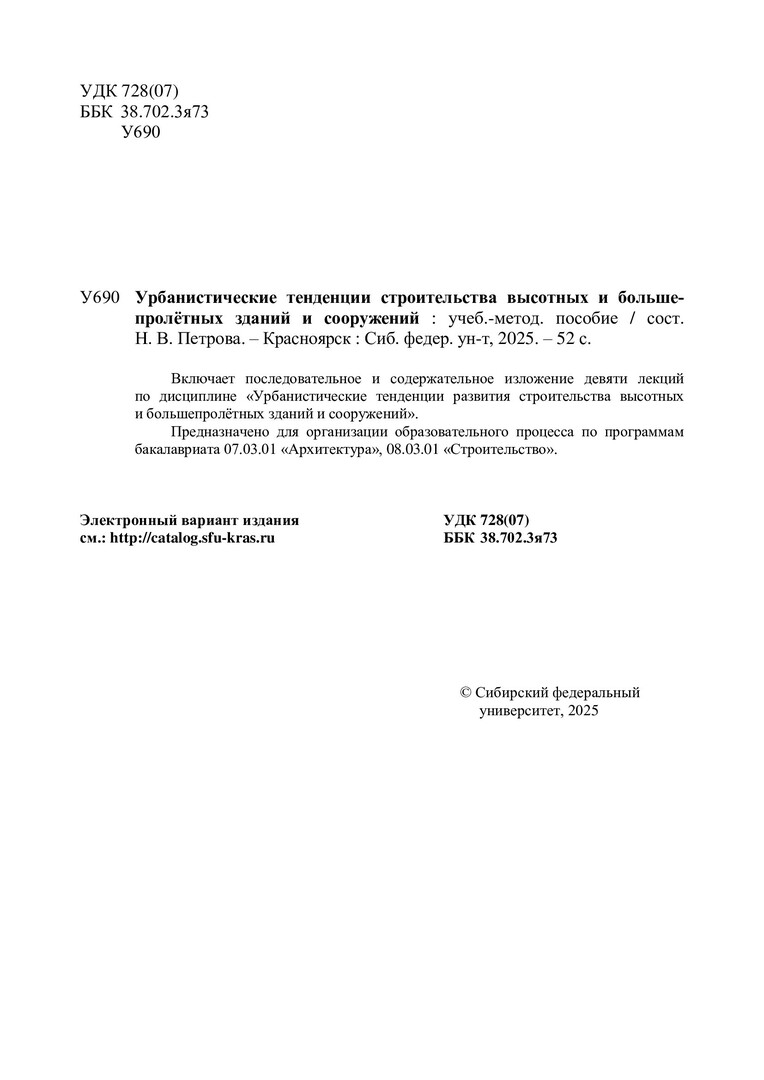 Библиографическое описание:Урбанистические тенденции строительства высотных и большепролетных зданий и сооружений : [краткие лекции]: учебно-методическое пособие / сост. Н. В. Петрова. - Электрон. текстовые дан. (pdf ; 1,0 Мб). - Красноярск : СФУ, 2025 (2025-05-21). - 52 с., 3.0 усл. печ. л. - Загл. с титул. экрана. - Электрон. версия печ. публикации . - Библиогр.: с. 47-48. - 100 экз. - Изд. № 2025-24481 : Б. ц. - Текст : электронный.