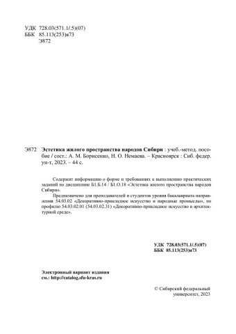 Библиографическое описание: Эстетика жилого пространства народов Сибири : учебно-методическое пособие / Сибирский федеральный университет, Институт архитектуры и дизайна ; сост.: А. М. Борисенко, Н. О. Немаева. - Электрон. текстовые дан. (5,2 Мб). - Красноярск : СФУ, 2023 (2023-09-05). - 44 с. - Загл. с титул. экрана. - Электрон. версия печ. публикации . - Библиогр.: с. 41-42. - 100 экз. - Изд. № 2023-19600 : Б. ц. - Текст : электронный.