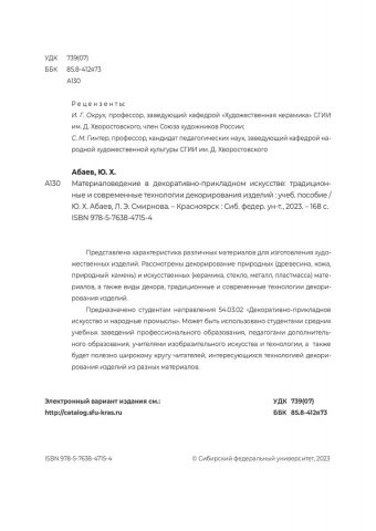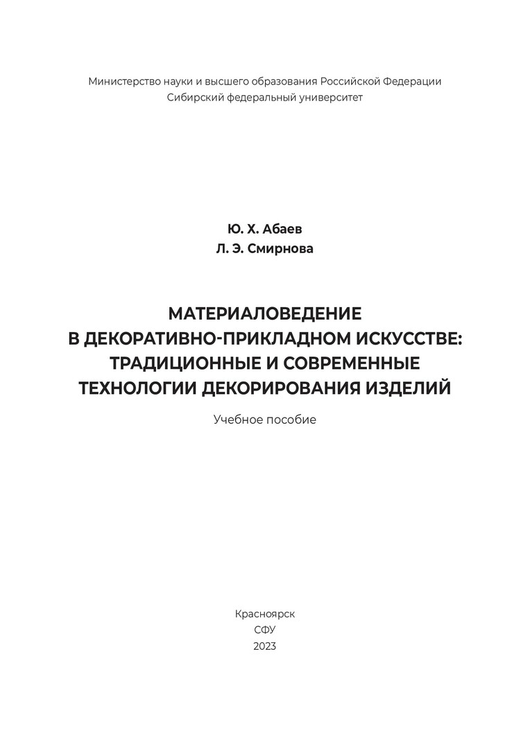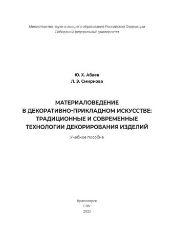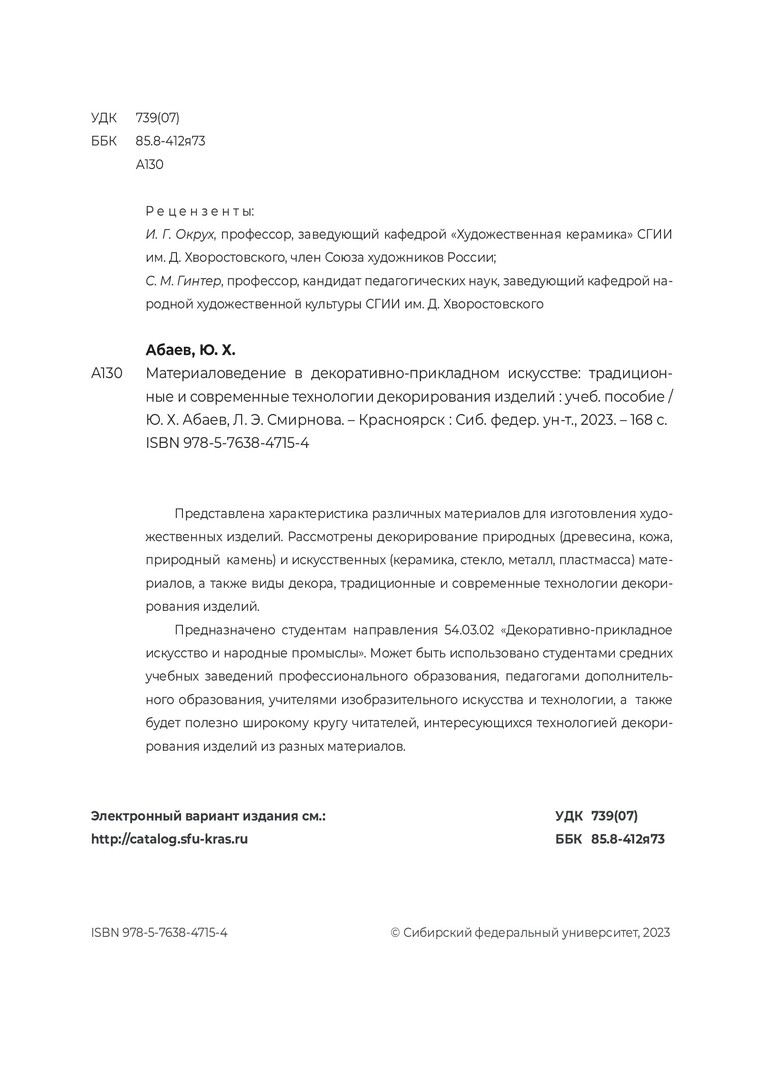 Библиографическое описание: Абаев, Юрий Хасанович. Материаловедение в декоративно-прикладном искусстве: традиционные и современные технологии декорирования изделий : учебное пособие / Ю. Х. Абаев, Л. Э. Смирнова ; рец.: И. Г. Окрух, С. М. Гинтер ; Сибирский федеральный университет, Институт архитектуры и дизайна. - Электрон. текстовые дан. (32,7 Мб). - Красноярск : СФУ, 2023 (2023-11-30). - 168 с. : цв. ил. - Загл. с титул. экрана. - Электрон. версия печ. публикации . - Библиогр.: с. 161-165. - 100 экз. - ISBN 978-5-7638-4715-4 : Б. ц. - Изд. № 2022-16607. - Текст : электронный.