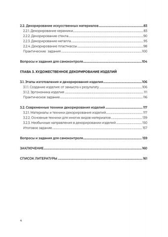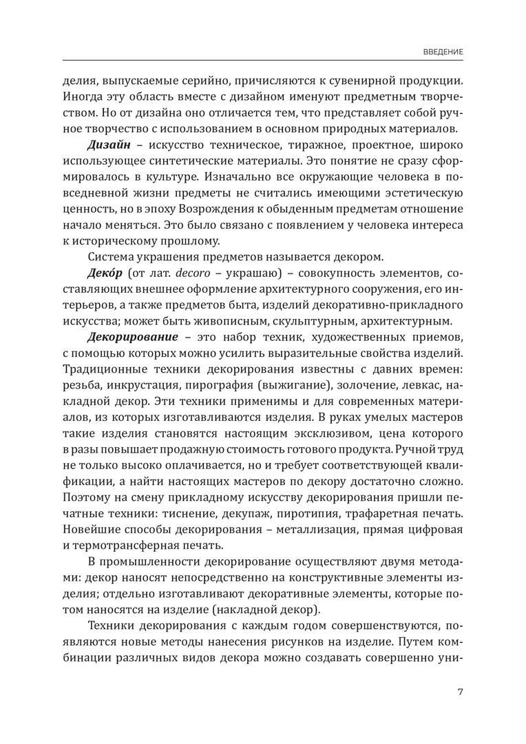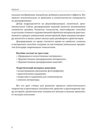 Аннотация: Представлена характеристика различных материалов для изготовления художественных изделий. Рассмотрены декорирование природных (древесина, кожа, природный камень) и искусственных (керамика, стекло, металл, пластмасса) материалов, а также виды декора, традиционные и современные технологии декорирования изделий. Предназначено студентам направления 54.03.02 «Декоративно-прикладное искусство и народные промыслы». Может быть использовано студентами средних учебных заведений профессионального образования, педагогами дополнительного образования, учителями изобразительного искусства и технологии, а также будет полезно широкому кругу читателей, интересующихся технологией декорирования изделий из разных материалов.