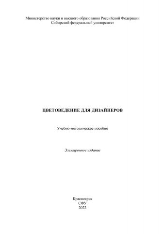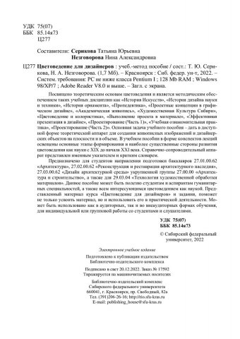 Библиографическое описание: Цветоведение для дизайнеров : учебно-методическое пособие / Сиб. федер. ун-т, Ин-т архитектуры и дизайна ; сост.: Т. Ю. Серикова, Н. А. Незговорова. - Электрон. текстовые дан. (pdf, 1,8 Мб). - Красноярск : СФУ, 2022 (2022-11-14). - 122 с. - Загл. с титул. экрана. - Изд. № 2022-17592 : Б. ц. - Текст : электронный.