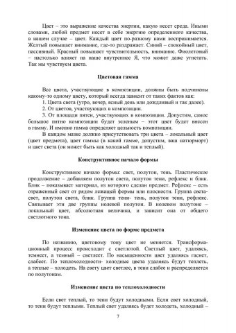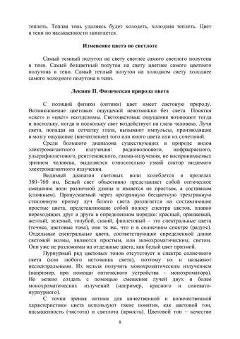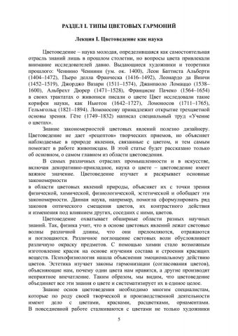 Аннотация: Посвящено теоретическим основам цветоведения и является методическим обеспечением таких учебных дисциплин как «История Искусств», «История дизайна науки и техники», «История орнамента», «Пропедевтика», «Проектные концепции в графическом дизайне», «Академическая живопись», «Художественная Культура Сибири», «Цветоведение и колористика», «Выполнение проекта в материале», «Эффективная презентация в дизайне», «Проектирование (Часть 1)», «Учебная ознакомительная практика», «Проектирование (Часть 2)». Основная задача учебного пособия – дать в доступ-ной форме теоретический аппарат для создания живописных изображений и дизайнерских объектов на плоскости и в объеме. В учебном пособии в форме конспектов лекций освещены основные этапы формирования и наиболее существенные стороны развития цветоведения как науки с ХIХ до начала ХХI века. Справочно-сопроводительный аппарат представлен именным указателем и кратким словарем. Предназначено для студентов направления подготовки бакалавров 27.01.00.62 «Архитектура», 27.02.00.62 «Реконструкция и реставрация архитектурного наследия», 27.03.00.62 «Дизайн архитектурной среды» укрупненной группы 27.00.00 «Архитектура и строительство», а также для 29.03.04 «Технология художественной обработки материалов». Данное пособие может быть полезно студентам и аспирантам гуманитарных специальностей, а также всем интересующимся цветоведением как наукой. Представленный материал курса «Цветоведение для дизайнеров» и задания, поможет не только усвоить материал, но и использовать его в практической деятельности. Может быть использовано как в аудиторных, так и во внеаудиторных формах обучения, для индивидуальной или групповой работы со студентами и слушателями.