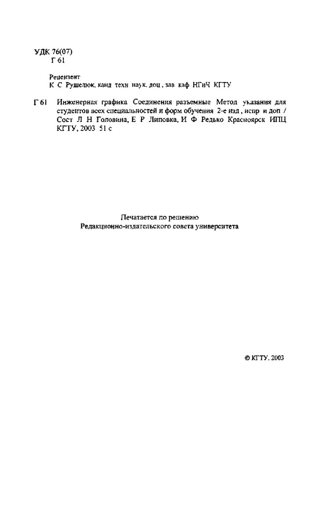 Библиографическое описание:Головина, Людмила Николаевна. Инженерная графика. Соединения разъемные : метод. указ. для студентов всех спец. и форм обучения / Л. Н. Головина, Е. Р. Липовка, И. Ф. Редько ; Краснояр. гос. техн. ун-т. - 2-е изд., испр. и доп. - Красноярск : ИПЦ КГТУ, 2003. - 51 с. - 6.00 р.