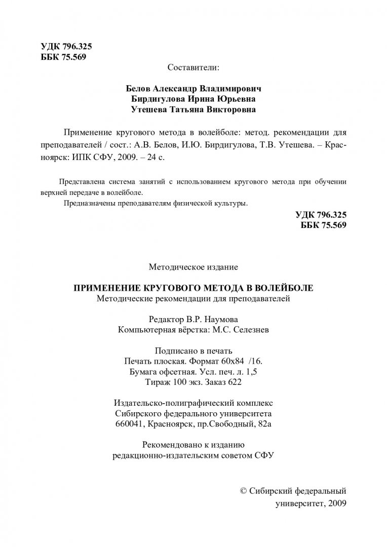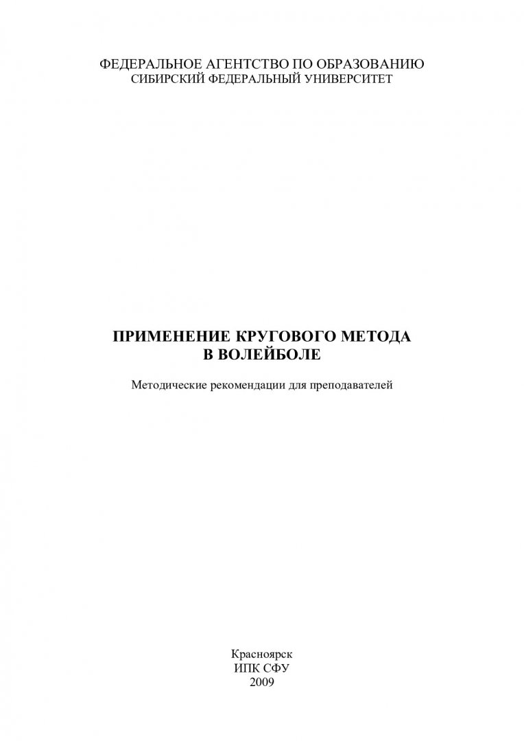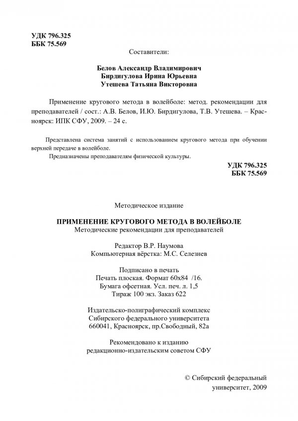 Библиографическое описание:Белов, Александр Владимирович. Применение кругового метода в волейболе : методические указания для преподавателей / А. В. Белов, И. Ю. Бирдигулова, Т. В. Утешева ; Сиб. федер. ун-т, Ин-т физ. культуры, спорта и туризма. - Красноярск : ИПК СФУ, 2009. - 23 с. - 100 экз. - 35.00 р. - Текст : непосредственный + Текст : электронный.