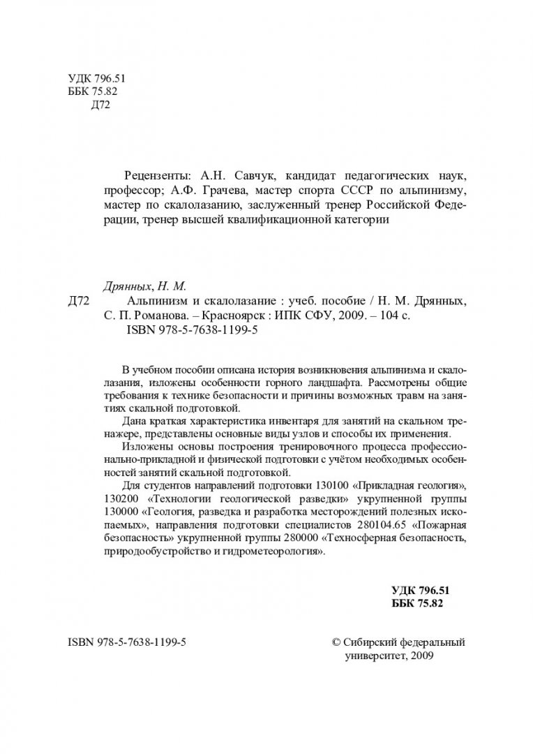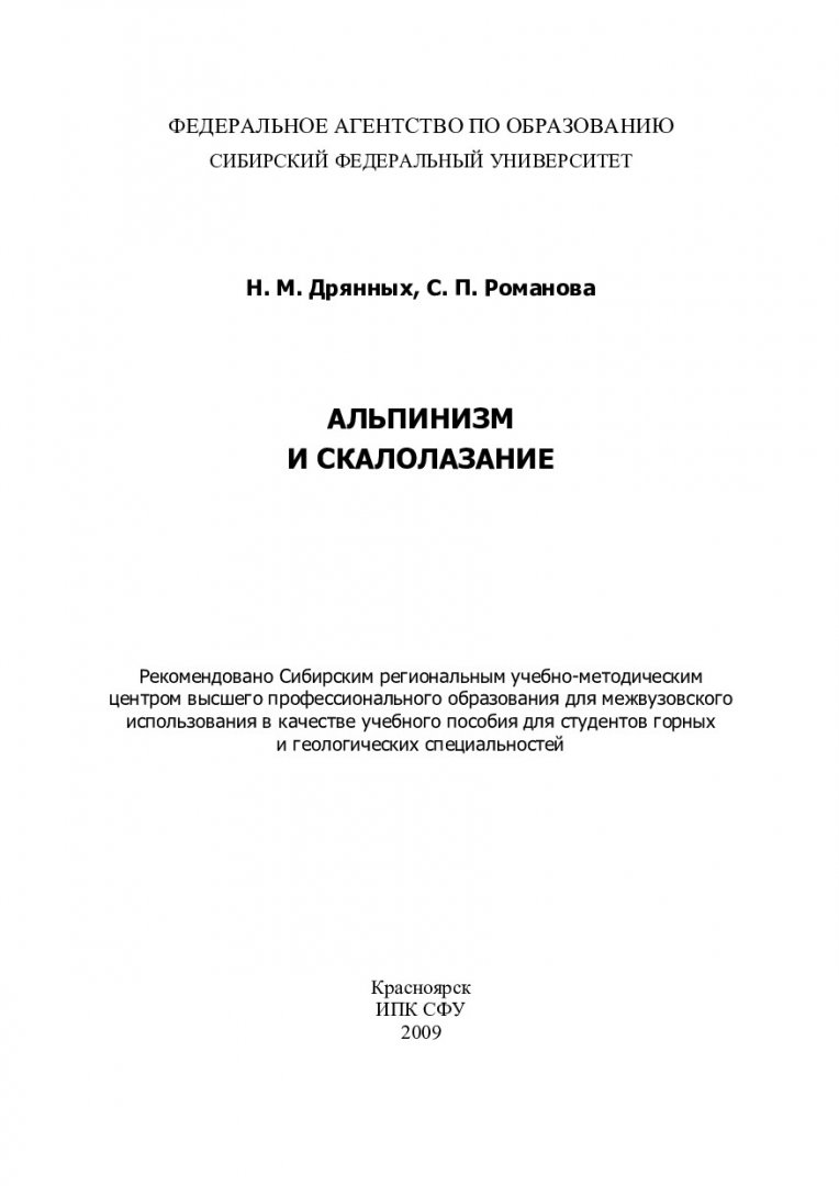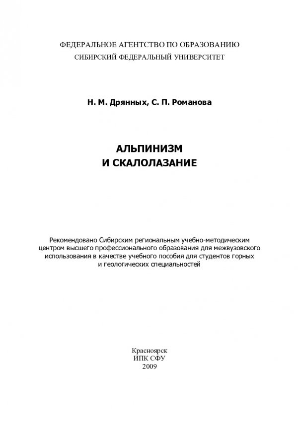 Библиографическое описание: Дрянных, Наталья Михайловна. Альпинизм и скалолазание : учебное пособие для студентов горных и геологических специальностей / Н. М. Дрянных, С. П. Романова ; Сибирский федеральный университет [СФУ]. - Красноярск : СФУ, 2009. - 103 с. : ил. - ISBN 978-5-7638-1199-5 : 47.00 р. - Текст : непосредственный : электронный.