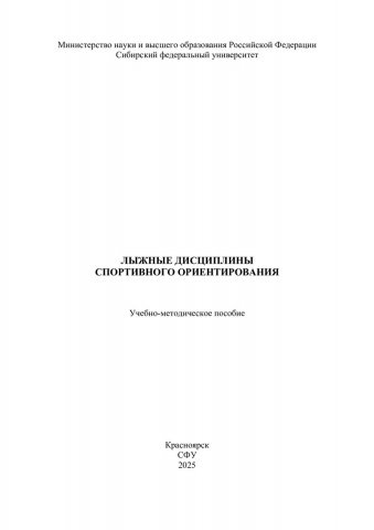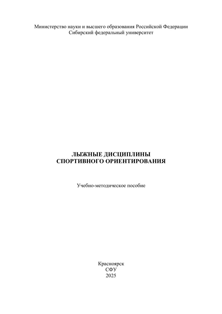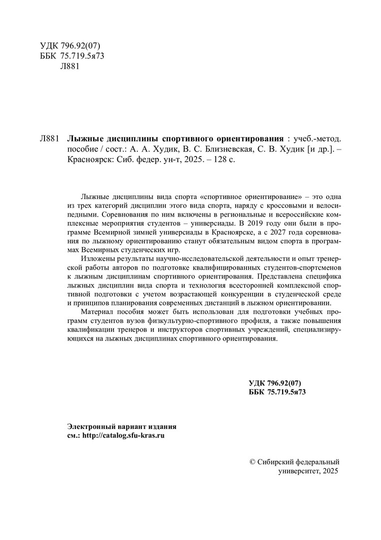 Библиографическое описание: Лыжные дисциплины спортивного ориентирования : учебно-методическое пособие / Сибирский федеральный университет, Институт физической культуры, спорта и туризма ; сост. А. А. Худик, В. С. Близневская, С. В. Худик[и др.]. - Электрон. текстовые дан. (4,4 Мб). - Красноярск : СФУ, 2025 (2025-02-10). - 128 с. : табл. - Загл. с титул. экрана. - Электрон. версия печ. публикации . - Библиогр.: с. 123-125. - 100 экз. - Изд. № 2024-22227 : Б. ц. - Текст : электронный.