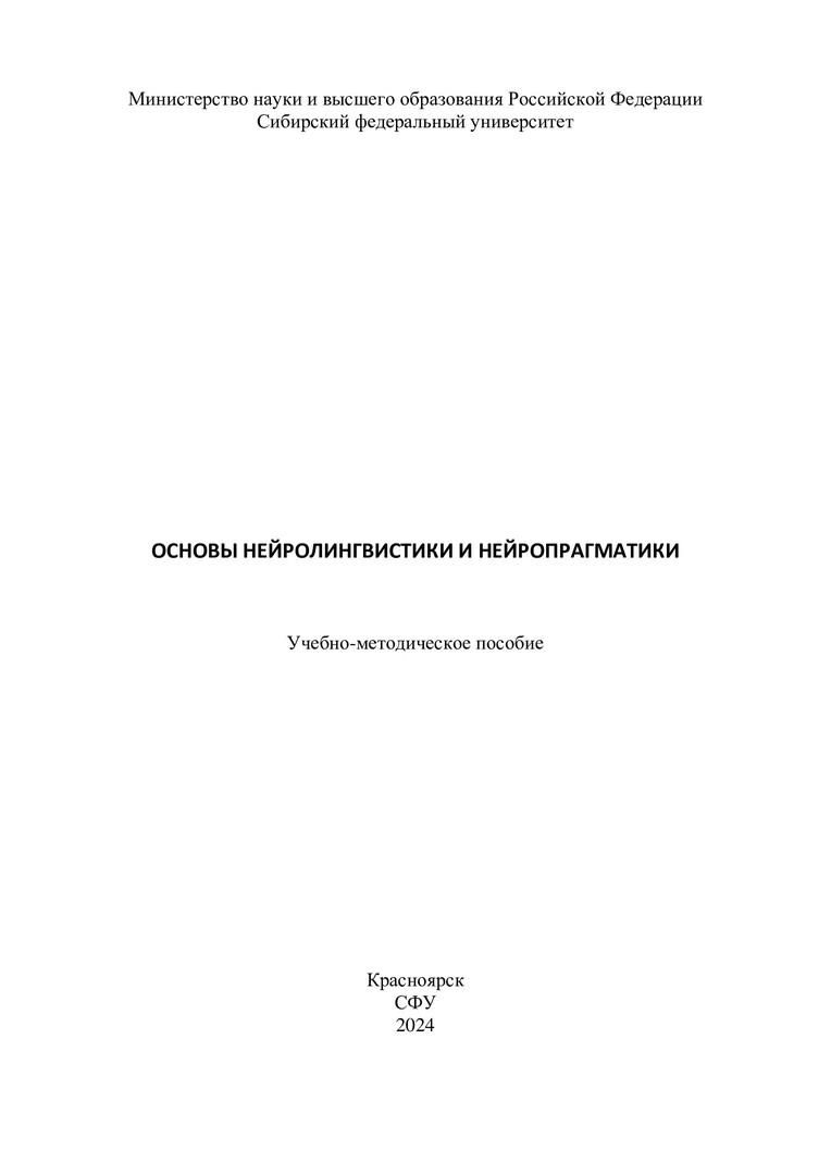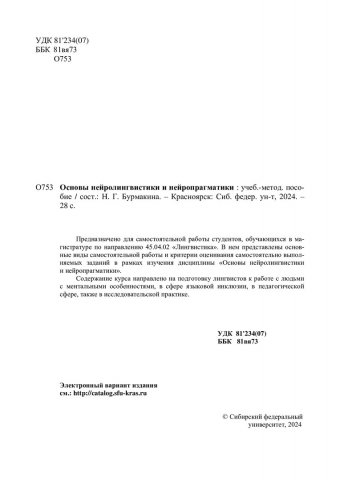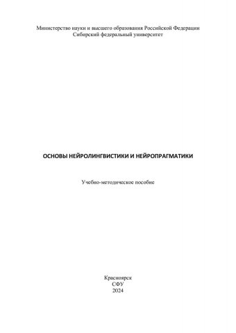 Библиографическое описание: Основы нейролингвистики и нейропрагматики : учебно-методическое пособие / Сибирский федеральный университет, Институт филологии и языковой коммуникации ; сост. Н. Г. Бурмакина. - Электрон. текстовые дан. (1,4 Мб). - Красноярск : СФУ, 2024 (2024-05-06). - 28 с. - Загл. с титул. экрана. - Электрон. версия печ. публикации . - Библиогр.: с. 24. - 100 экз. - Изд. № 2024-21787 : Б. ц. - Текст : электронный.