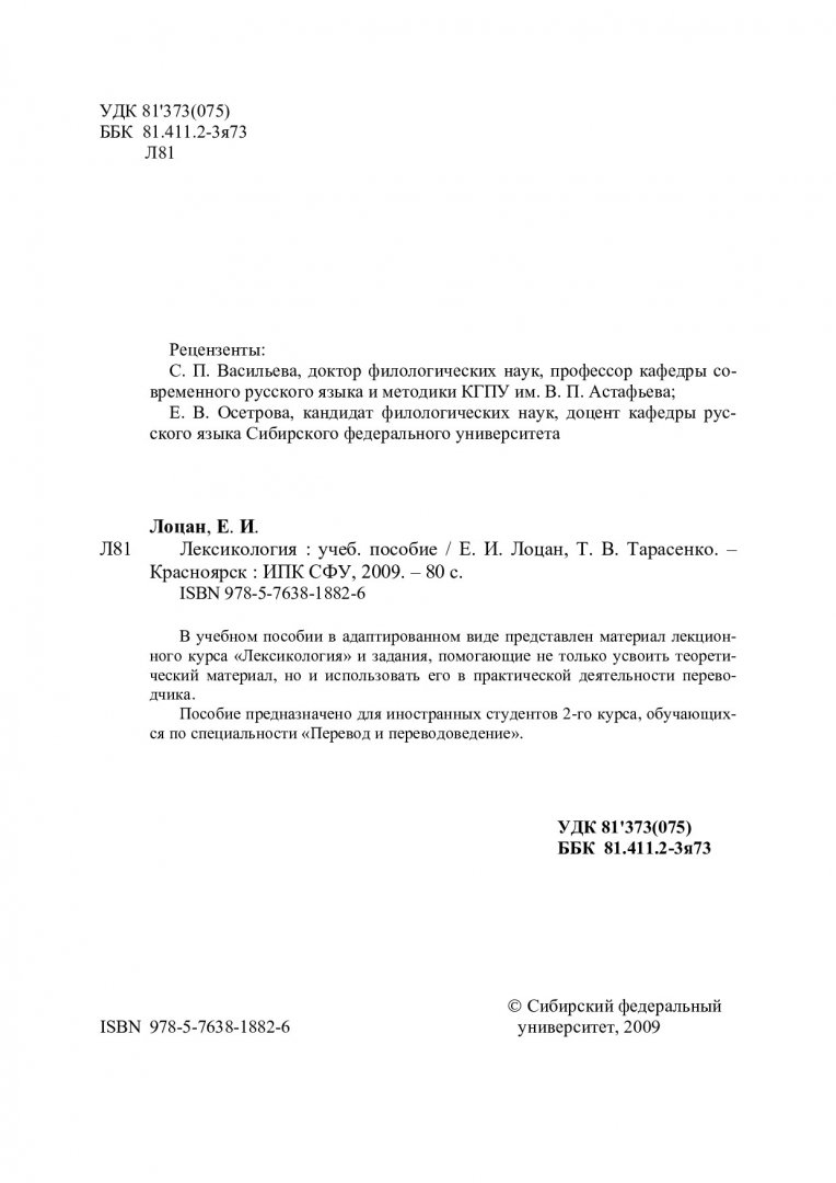 Библиографическое описание:Лоцан, Елена Ивановна. Лексикология [на уроках русского языка как иностранного] : учебное пособие : утверждено редакционно - издательским советом университета / Е. И. Лоцан, Т. В. Тарасенко ; Сибирский федеральный университет [СФУ]. - Красноярск : Информационно-полиграфический комплекс [ИПК] СФУ, 2009. - 78 с. - Библиогр. список: с.73-77. - ISBN 978-5-7638-1882-6 : 69 р. - Текст : непосредственный + Текст : электронный. Режим доступа: читальные залы НБ СФУ