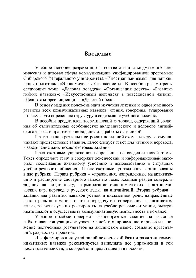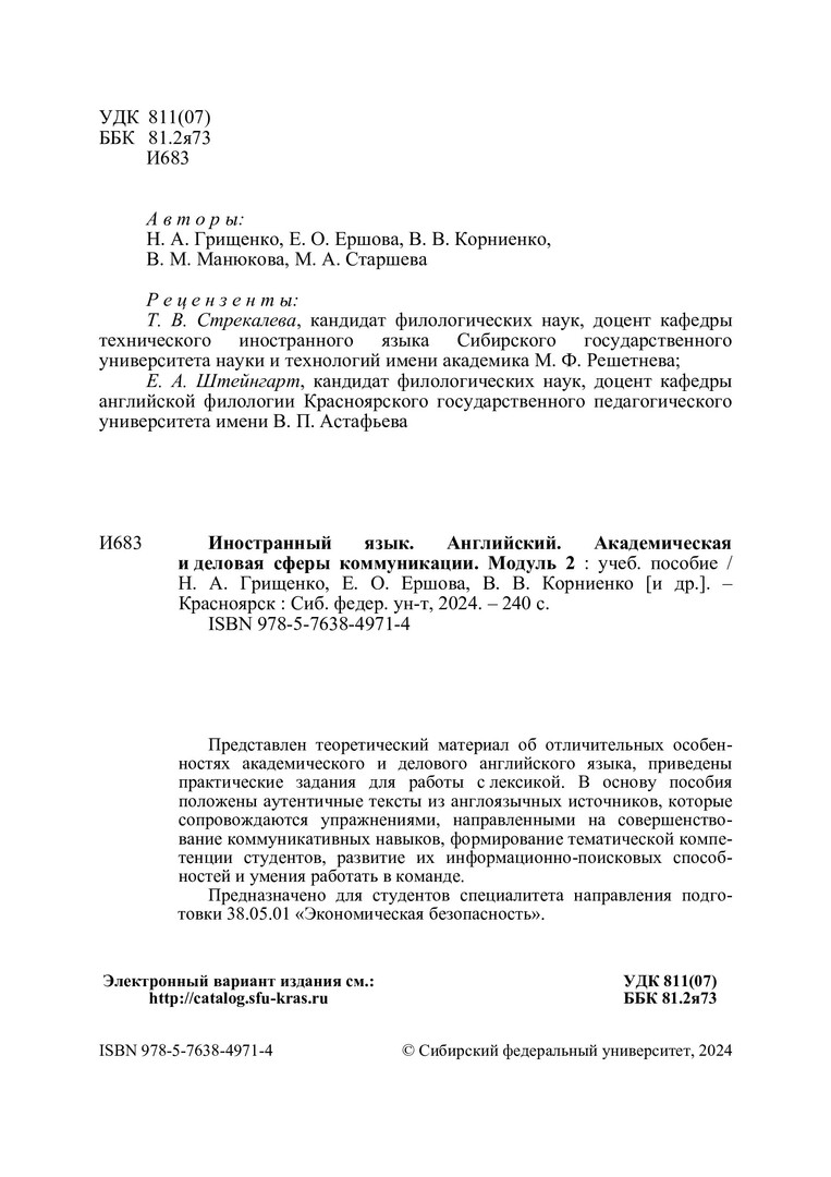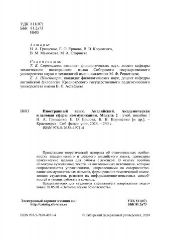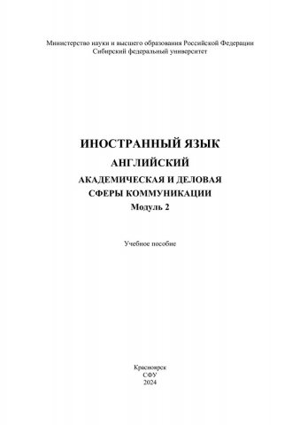 Библиографическое описание: Иностранный язык. Английский. Академическая и деловая сферы коммуникации. Модуль 2 : учебное пособие / Н. А. Грищенко, Е. О. Ершова, В. В. Корниенко [и др.] ; рец.: Т. В. Стрекалева, Е. А. Штейнгарт ; Сибирский федеральный университет, Институт управления бизнес-процессами. - Электрон. текстовые дан. (2,3 Мб). - Красноярск : СФУ, 2024 (2024-07-24). - 241 с. : ил., табл. - Загл. с титул. экрана. - Электрон. версия печ. публикации . - 100 экз. - ISBN 978-5-7638-4971-4 : Б. ц. - Изд. № 2024-21476. - Текст : электронный.