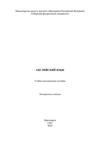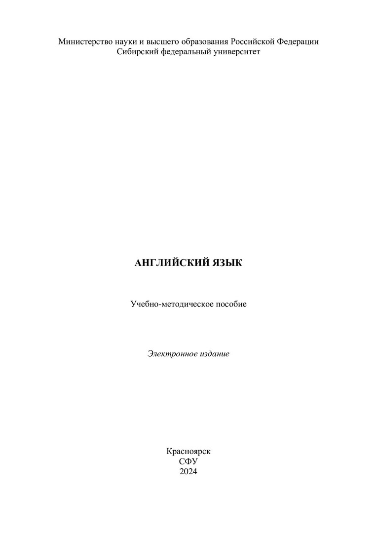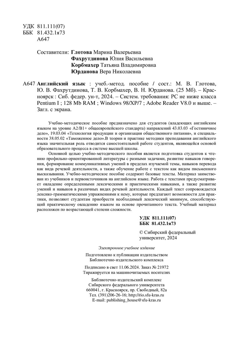Библиографическое описание: Английский язык : учебно-методическое пособие / Сиб. федер. ун-т, Ин-т торговли и сферы услуг ; сост. М. В. Глотова [и др.]. - Электрон. текстовые дан. (pdf, 24,1 Мб). - Красноярск : СФУ, 2024 (2024-06-11). - 79 с. - Загл. с титул. экрана. - Изд. № 2024-21972 : Б. ц. - Текст : электронный.