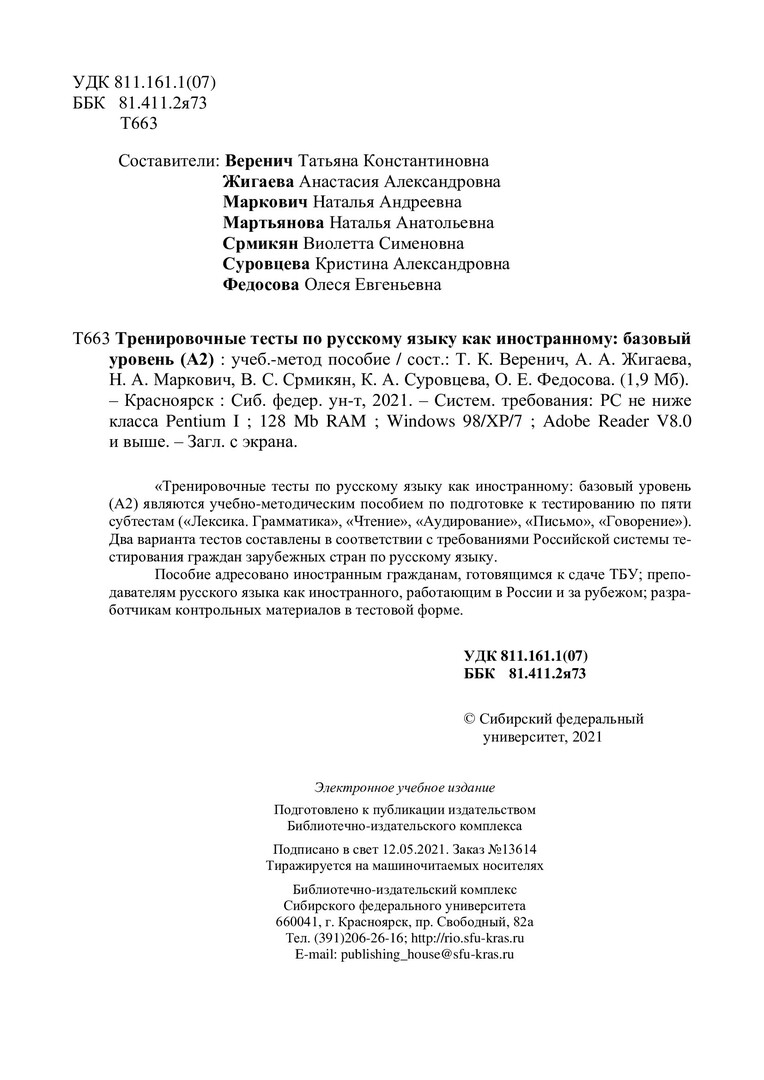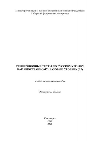 Библиографическое описание: Тренировочные тесты по русскому языку как иностранному: базовый уровень (А2) : учебно-методическое пособие / Сиб. федер. ун-т, Ин-т филологии и яз. коммуникации ; сост. Т. К. Веренич [и др.]. - Электрон. текстовые дан. (pdf, 1,4 Мб). - Красноярск : СФУ, 2021 (2021-04-27). - 90 с. - Загл. с титул. экрана. - Изд. № 2021-13614 : Б. ц. - Текст : электронный.