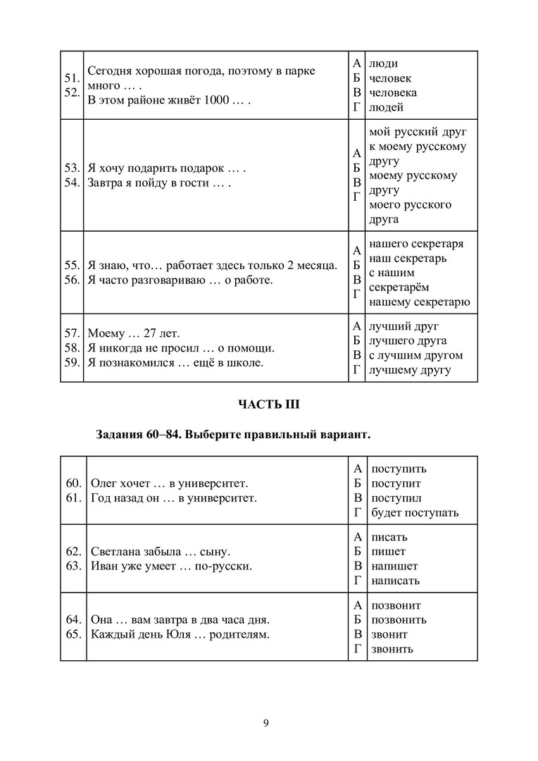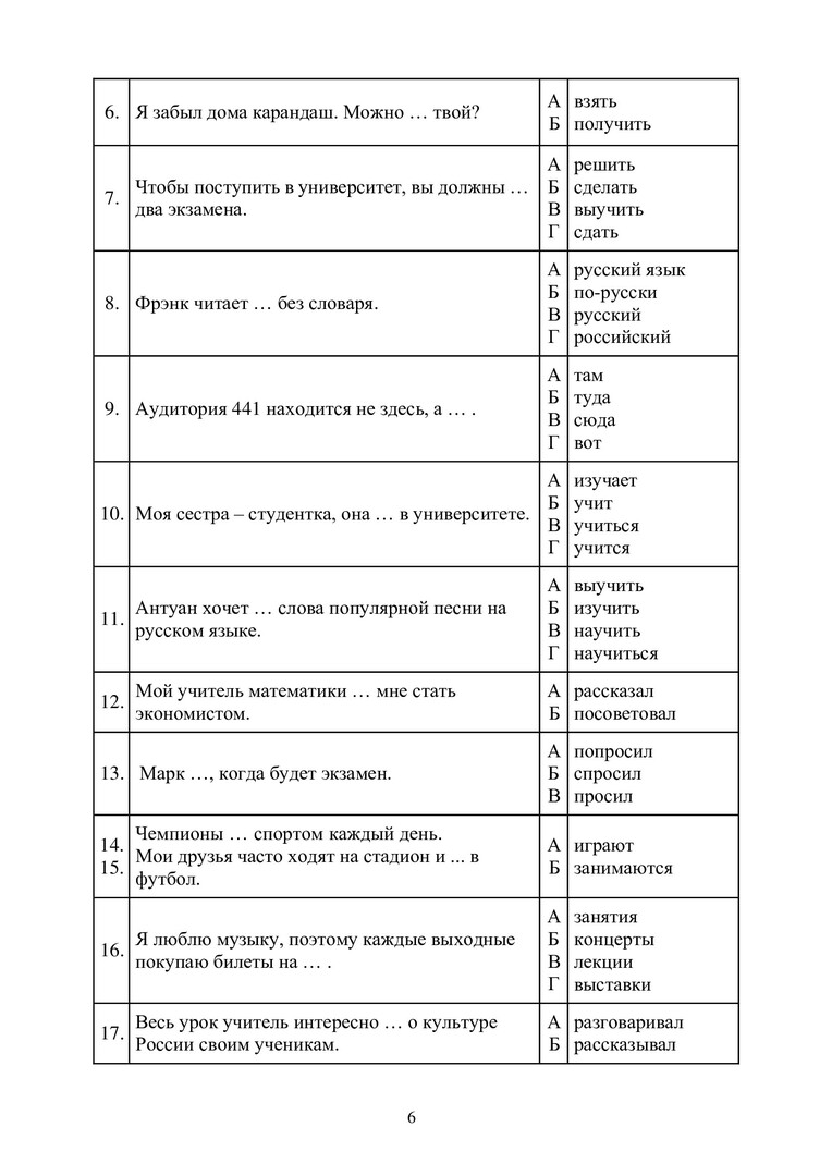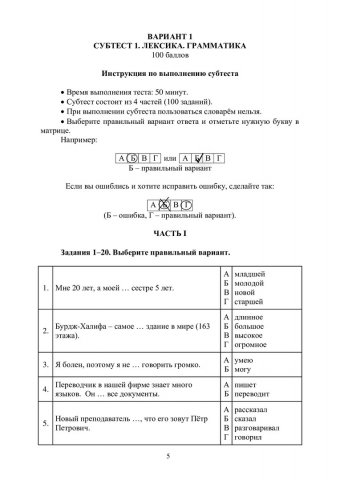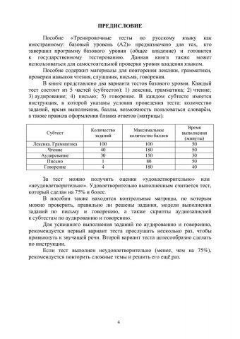Аннотация: «Тренировочные тесты по русскому языку как иностранному: базовый уровень (А2) являются учебно-методическим пособием по подготовке к тестированию по пяти субтестам («Лексика. Грамматика», «Чтение», «Аудирование», «Письмо», «Говорение»). Два варианта тестов составлены в соответствии с требованиями Российской системы тестирования граждан зарубежных стран по русскому языку. Пособие адресовано иностранным гражданам, готовящимся к сдаче ТБУ; преподавателям русского языка как иностранного, работающим в России и за рубежом; разработчикам контрольных материалов в тестовой форме.
