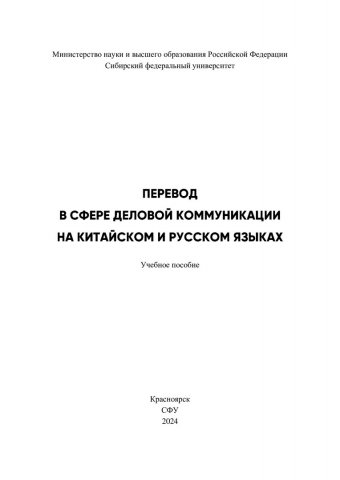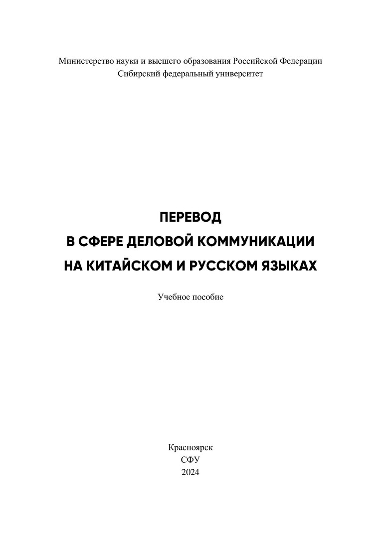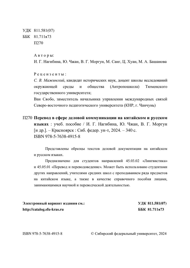 Библиографическое описание: Перевод в сфере деловой коммуникации на китайском и русском языках : учебное пособие / И. Г. Нагибина, Ю. Чжан, В. Г. Моргун [и др.] ; рец.: С. В. Мажинский, В. Сяобо ; Сибирский федеральный университет, Институт филологии и языковой коммуникации. - Электрон. текстовые дан. (10,6 Мб). - Красноярск : СФУ, 2024 (2024-11-25). - 340 с., 21.2 усл. печ. л. - Загл. с титул. экрана. - Электрон. версия печ. публикации . - 100 экз. - ISBN 978-5-7638-4915-8 : Б. ц. - Изд. № 2023-20657. - Текст : электронный.
