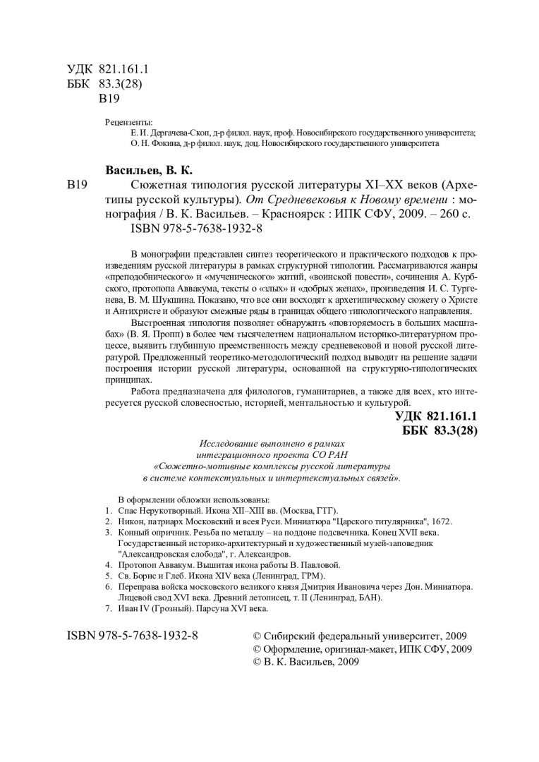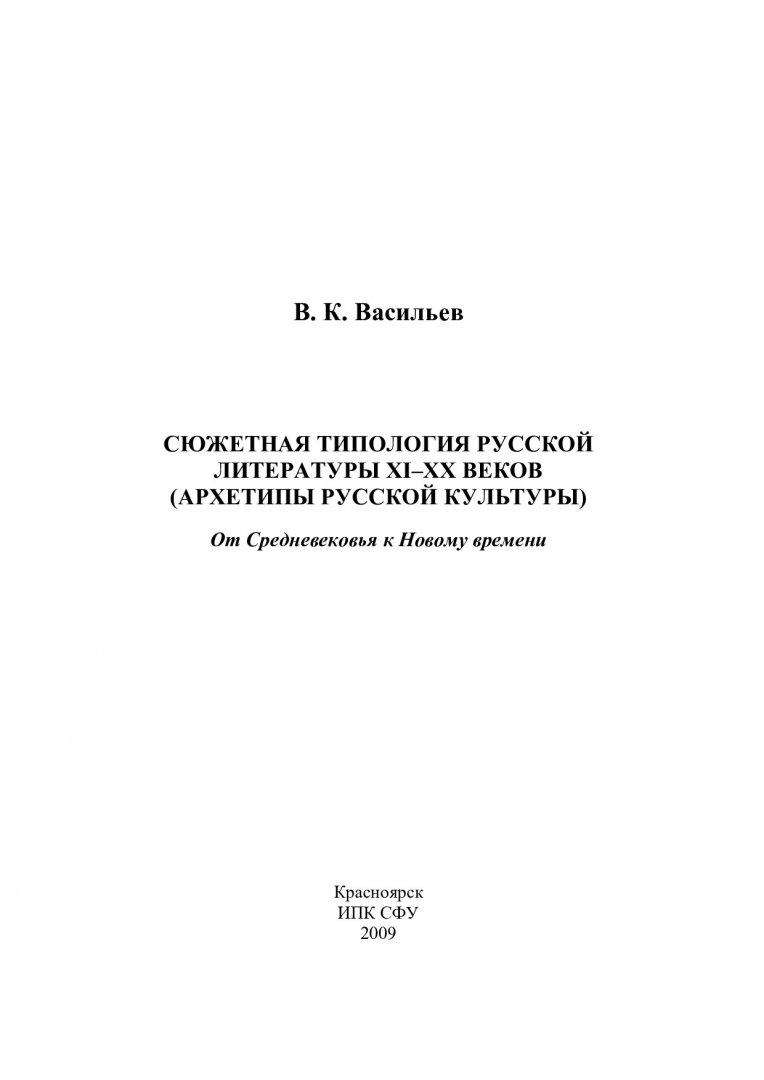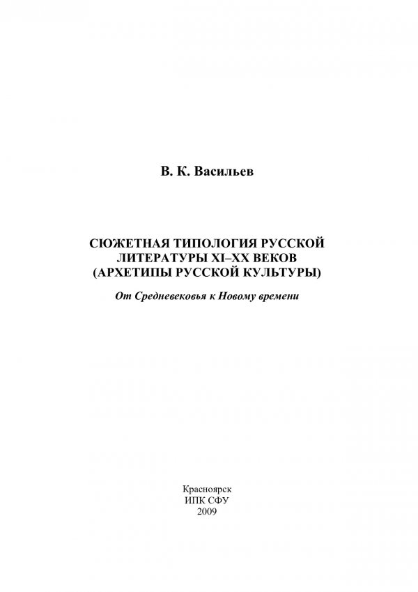 Библиографическое описание: Васильев, Владимир Кириллович. Сюжетная типология русской литературы XI-XX веков (Архетипы русской культуры). От Средневековья к Новому времени : монография / В. К. Васильев. - Красноярск : Информационно-полиграфический комплекс [ИПК] СФУ, 2009. - 258 с. - Указ. имён : с. 243-256. - ISBN 978-5-7638-1932-8 : 150.00 р. - Текст : непосредственный + Текст : электронный.