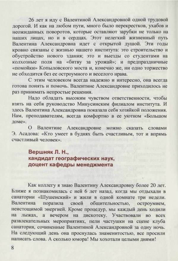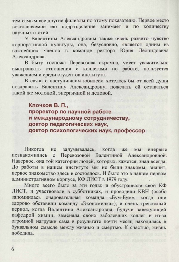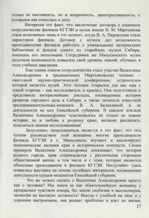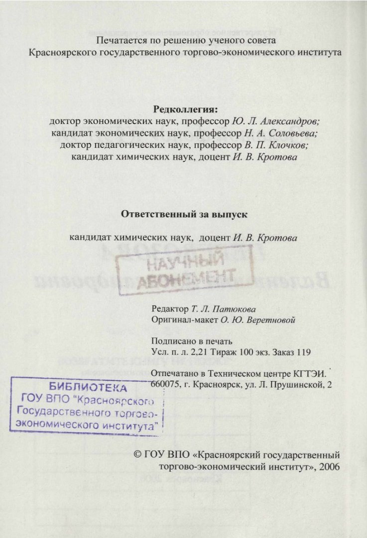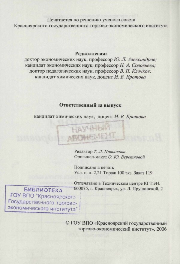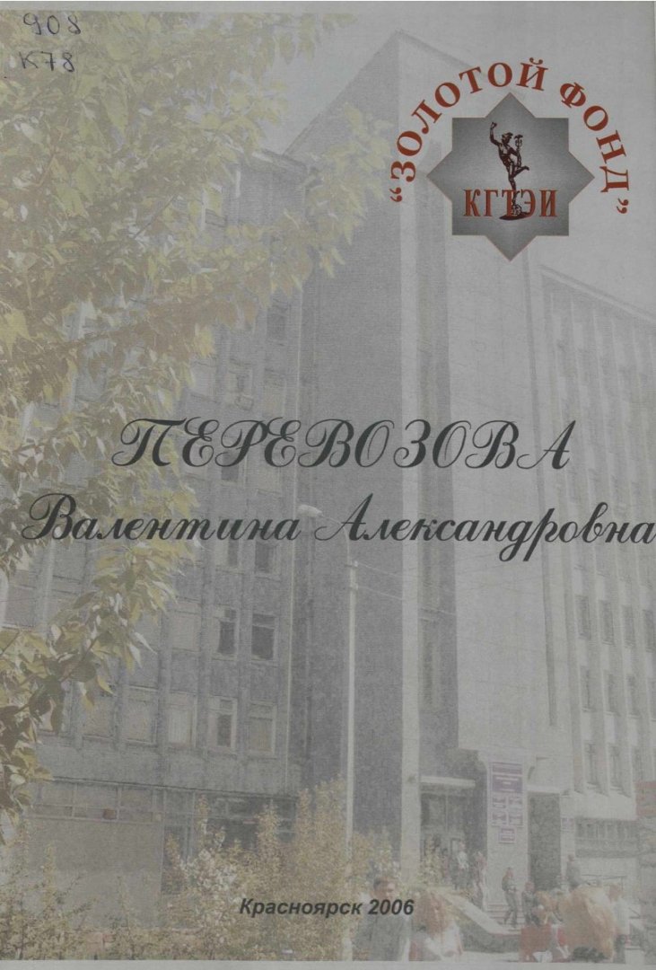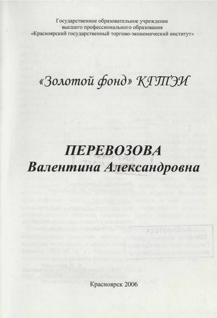 Библиографическое описание: Красноярский государственный торгово-экономический институт (Красноярск). Перевозова Валентина Александровна : справочное издание / Краснояр. гос. торг.-экон. ин-т ; редкол. Ю. Л. Александров, редкол. Н. А. Соловьева, редкол. В. П. Клочков, редкол., отв. за вып. И. В. Кротова. - Электрон. текстовые дан. (pdf, 11.4 Мб). - Красноярск : КГТЭИ, 2006. - 29 с. : Фот. - ("Золотой фонд" КГТЭИ). - Загл. с титул. экрана. - Электрон. версия печ. публикации . - 100 экз. - 15.00 р. - Текст : непосредственный + Текст : электронный.