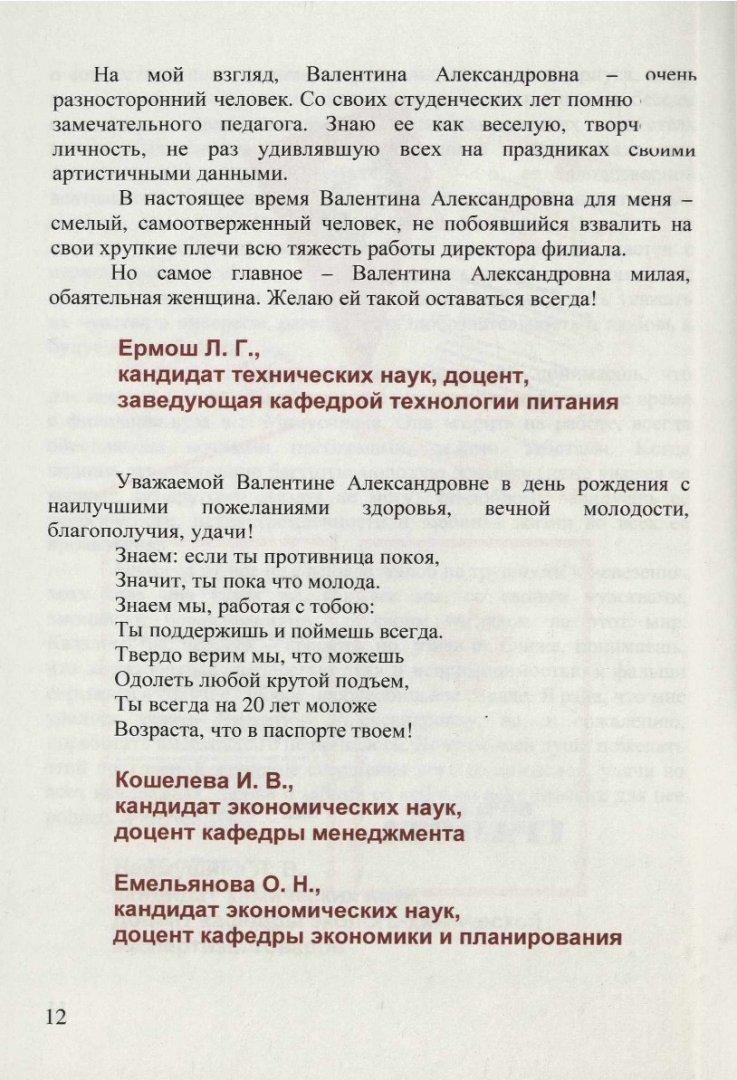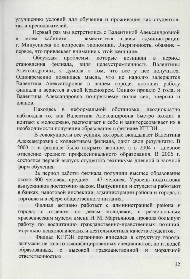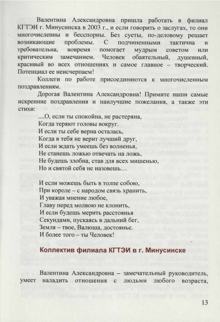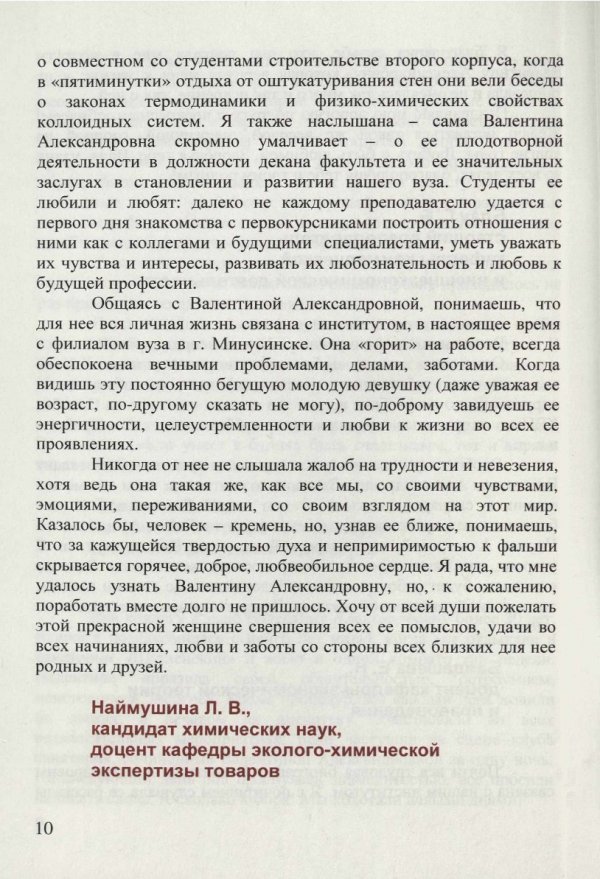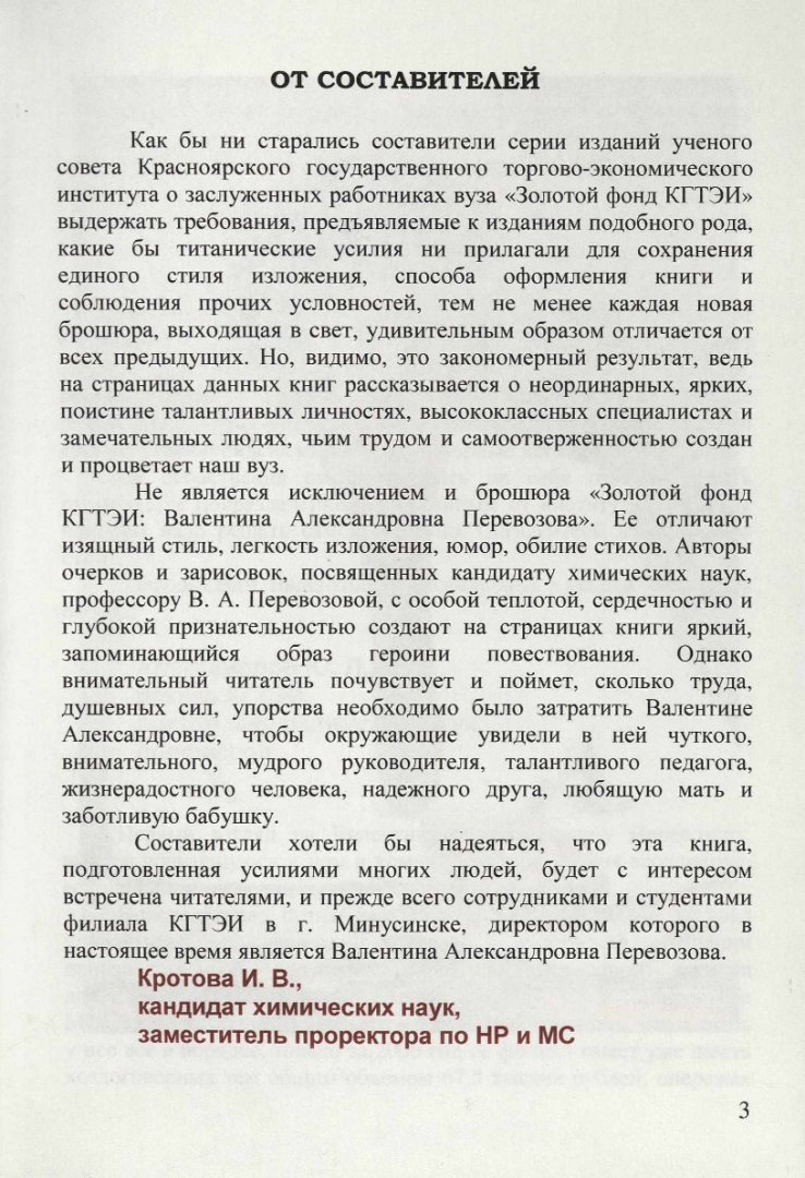 Аннотация: Брошюру «Золотой фонд КГТЭИ: Валентина Александровна Перевозова», отличают изящный стиль, легкость изложения, юмор, обилие стихов. Авторы очерков и зарисовок, посвященных кандидату химических наук, профессору В. А. Перевозовой, с особой теплотой, сердечностью и глубокой признательностью создают на страницах книги яркий, запоминающийся образ героини повествования.