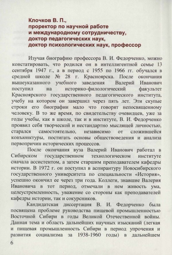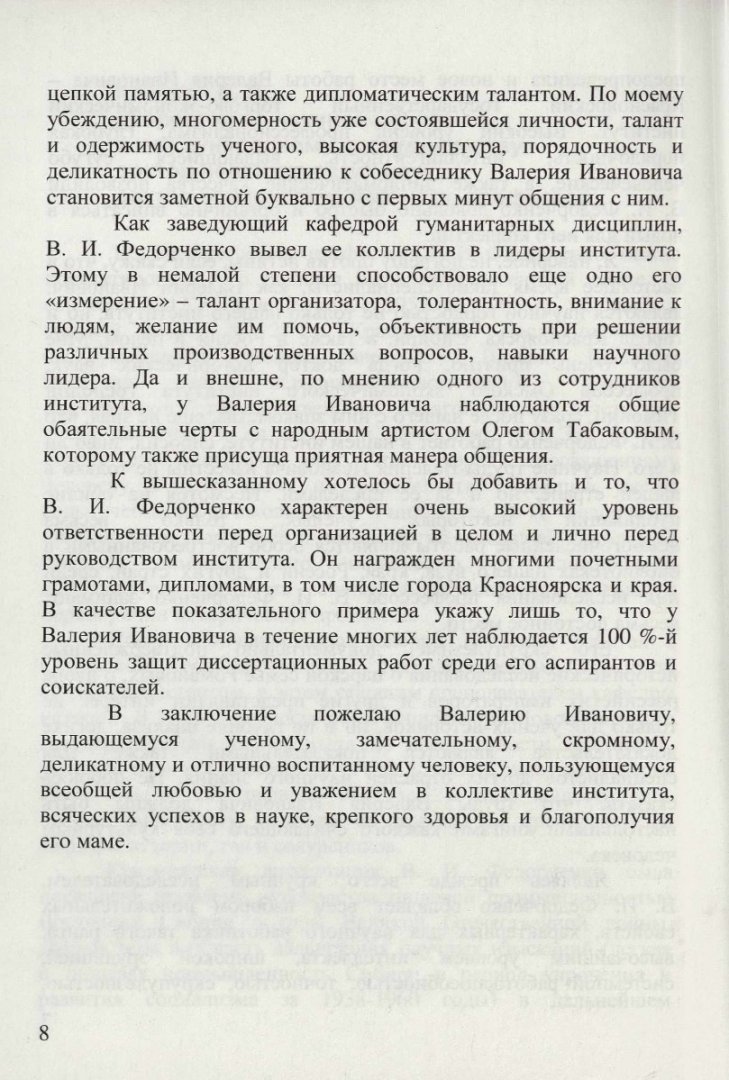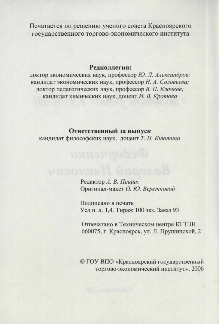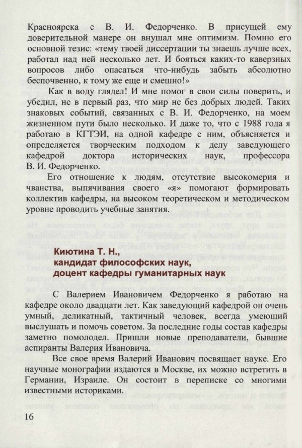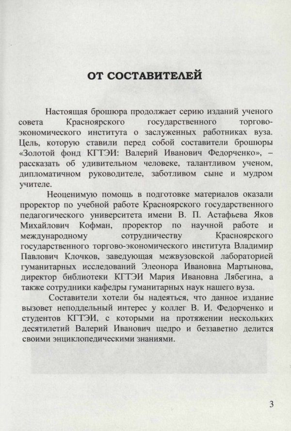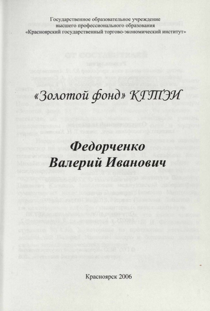 Аннотация: Настоящая брошюра продолжает серию изданий ученого совета Красноярского государственного торгово-экономического института о заслуженных работниках вуза. Цель, которую ставили перед собой составители брошюры «Золотой фонд КГТЭИ: Валерий Иванович Федорченко», - рассказать об удивительном человеке, талантливом ученом, дипломатичном руководителе, заботливом сыне и мудром учителе.