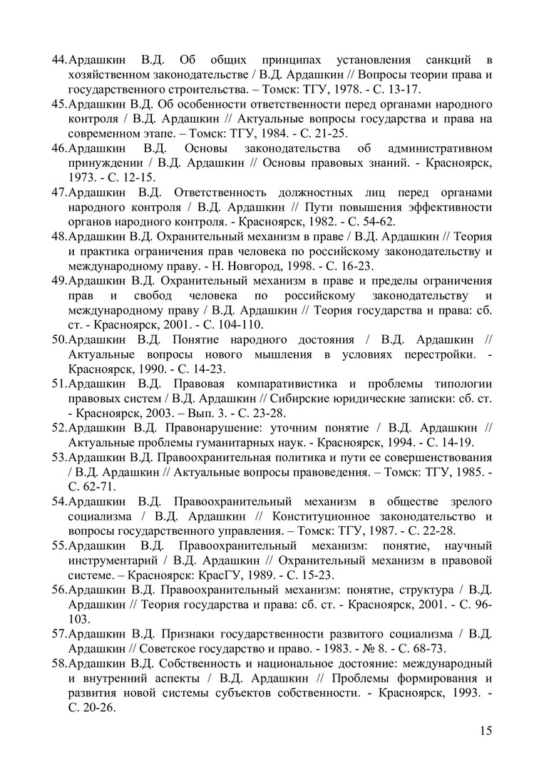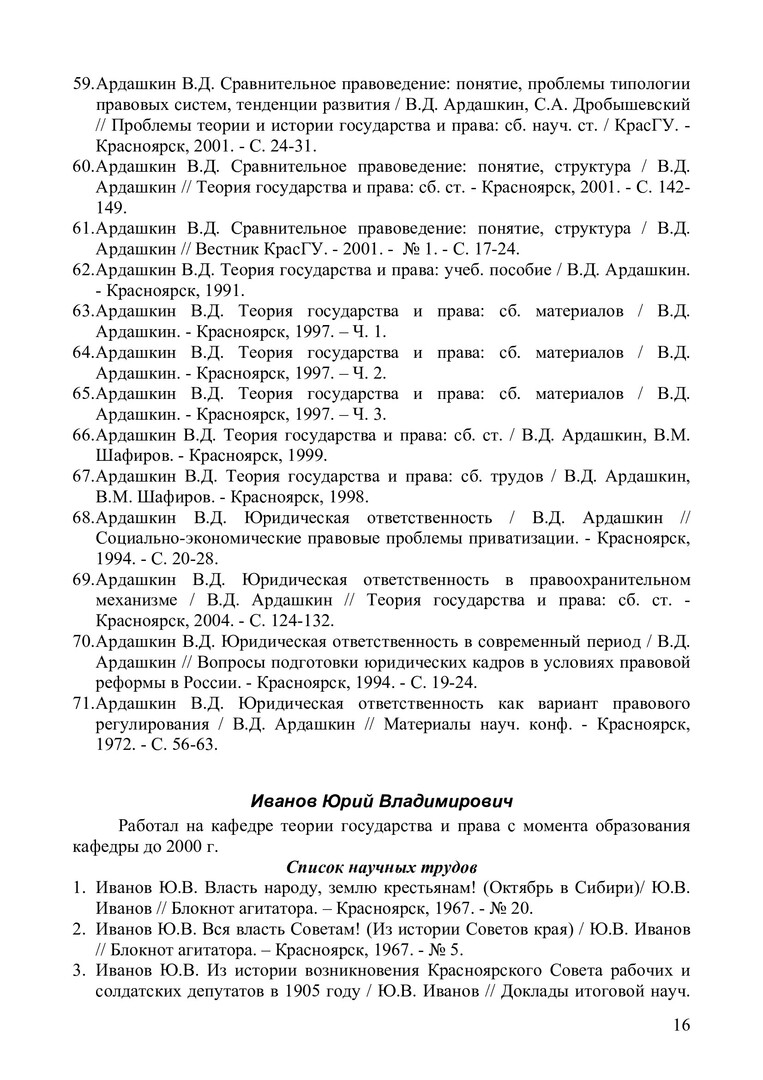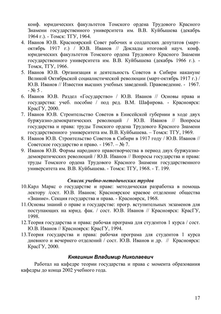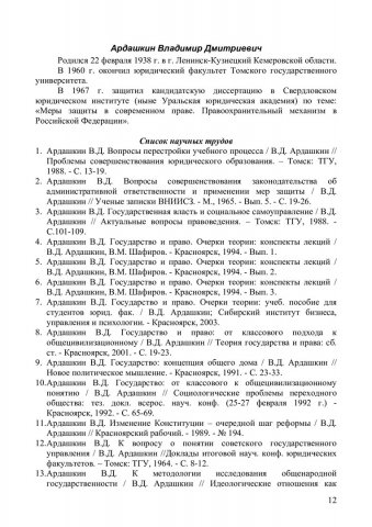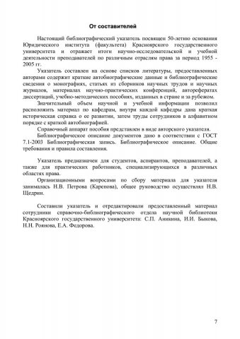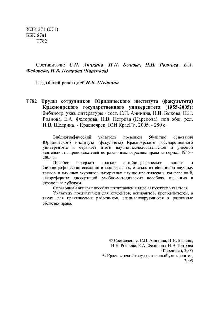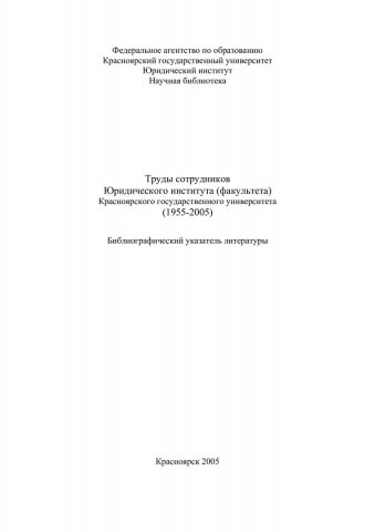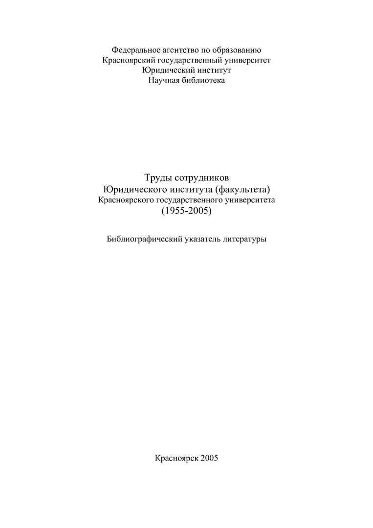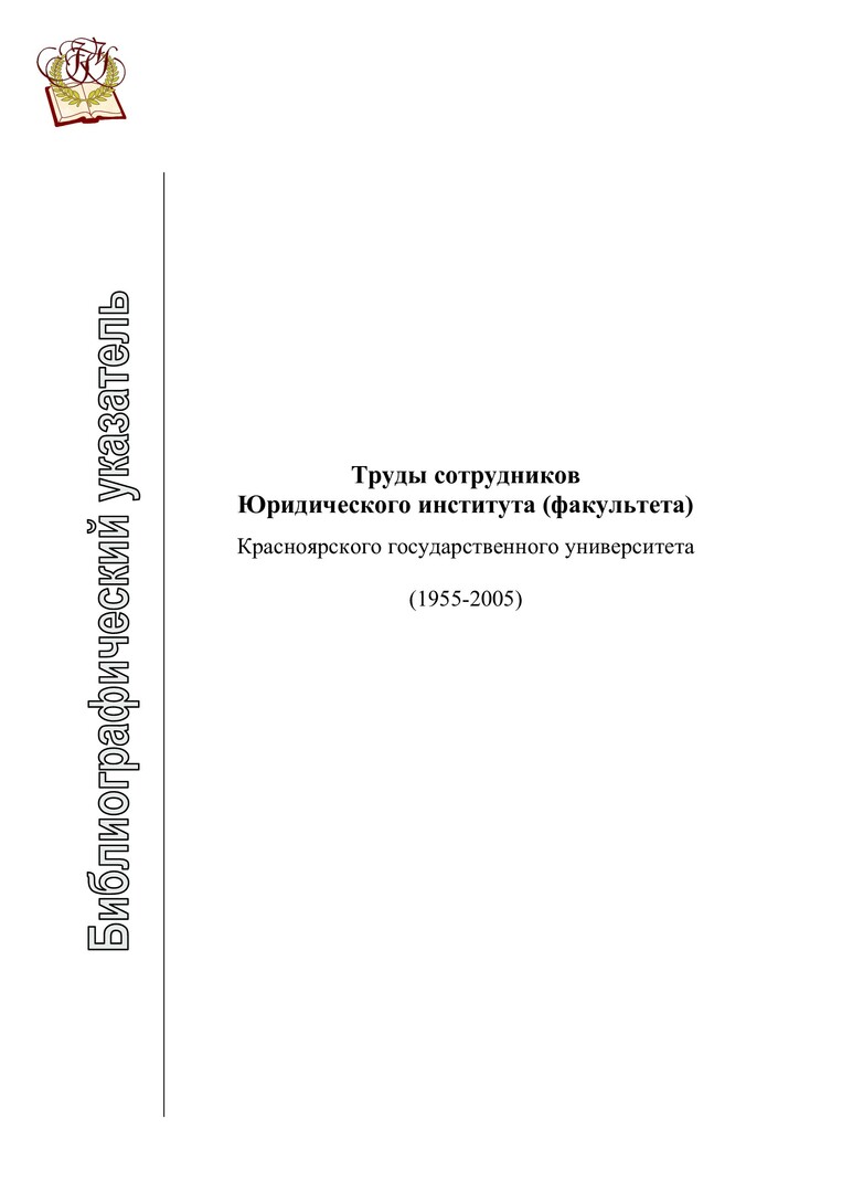 Библиографическое описание:Труды сотрудников Юридического института (факультета) Красноярского государственного университета, 1955-2005 : библиографический указатель литературы / Красноярский государственный университет, Научная библиотека ; ред. Н. В. Щедрин ; сост.: С. П. Аникина, И. И. Быкова, Н. Н. Роянова [и др.]. - Электрон. текстовые дан. (pdf ; 1.7Мб). - Красноярск : КрасГУ, 2005. - Загл. с титул. экрана. - Электрон. версия печ. публикации . - Б. ц. - Текст : электронный.