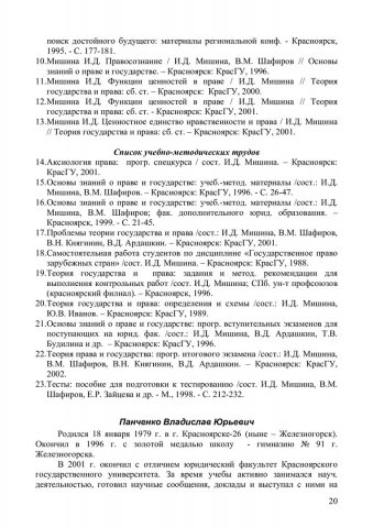 Аннотация:Библиографический указатель посвящен 50-летию основания Юридического института (факультета) Красноярского государственного университета и отражает итоги научно-исследовательской и учебной деятельности преподавателей по различным отраслям права за период 1955-2005 гг. Пособие содержит краткие автобиографические данные и библиографические сведения о монографиях, статьях из сборников научных трудов и научных журналов, материалах научно-практических конференций, авторефератах диссертаций, учебно-методических пособиях, изданных в стране и за рубежом. Справочный материал представлен в виде авторского указателя. Указатель предназначен для студентов, аспирантов, преподавателей, а также для практических работников, специализирующихся в различных областях права.