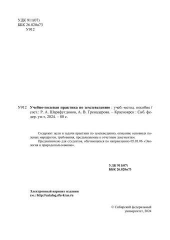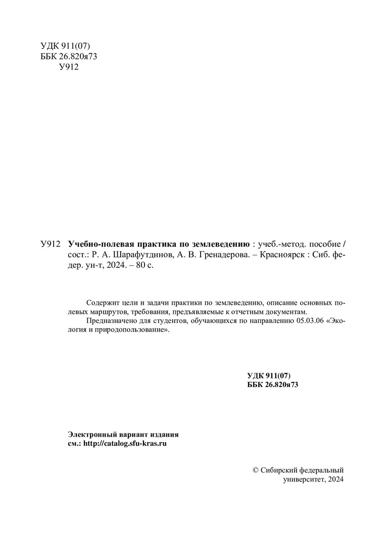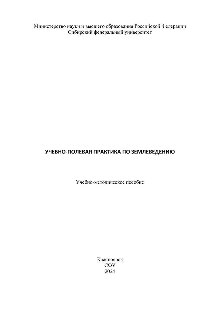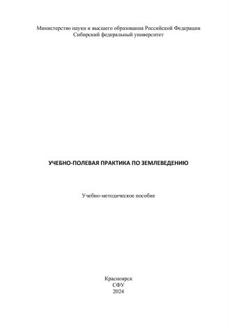 Библиографическое описание: Учебно-полевая практика по землеведению : учебно-методическое пособие / Сибирский федеральный университет, Институт экологии и географии ; [сост.: Р. А. Шарафутдинов, А. В. Гренадерова]. - Красноярск : СФУ, 2024 (2024-01-12). - 80 с. : ил., цв. ил., табл. - Библиогр.: с. 73-74. - 100 экз. - Изд. № 2023-20724 : Б. ц. - Текст : электронный : непосредственный.
