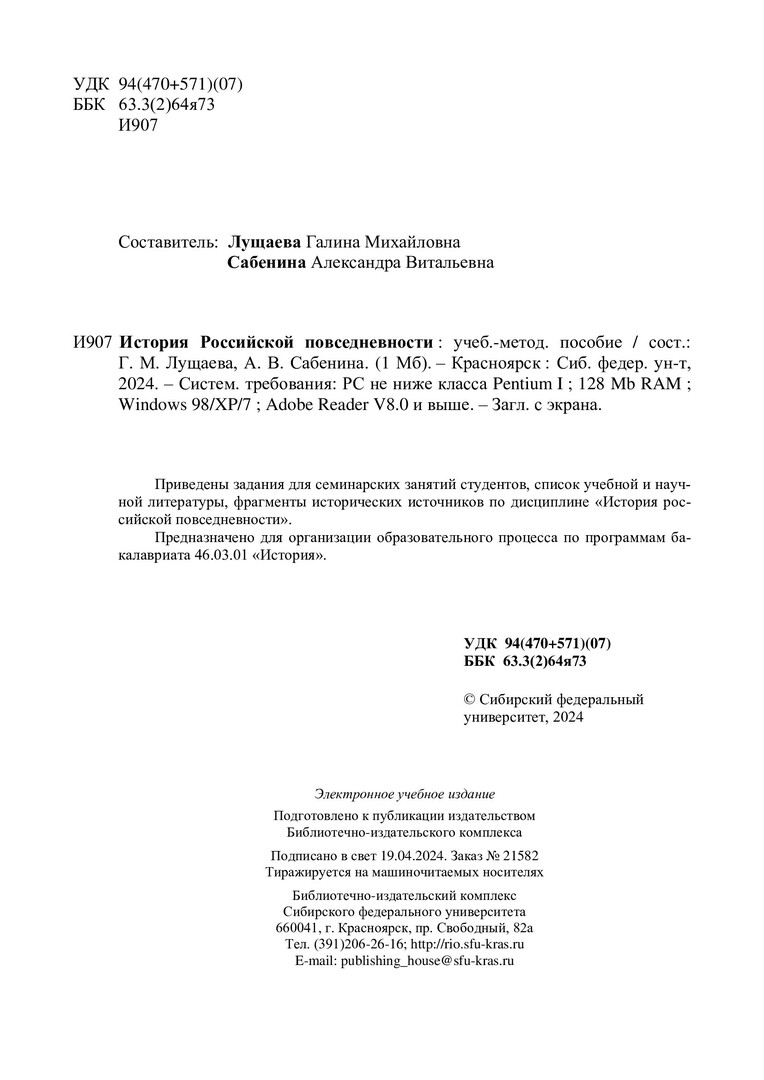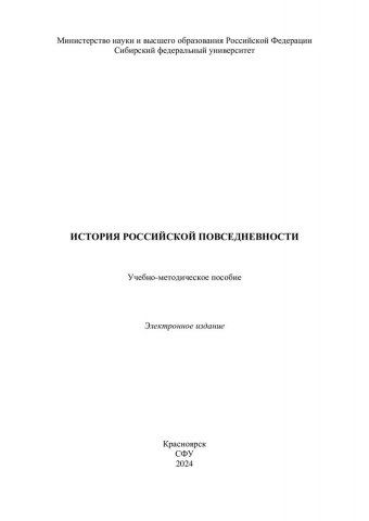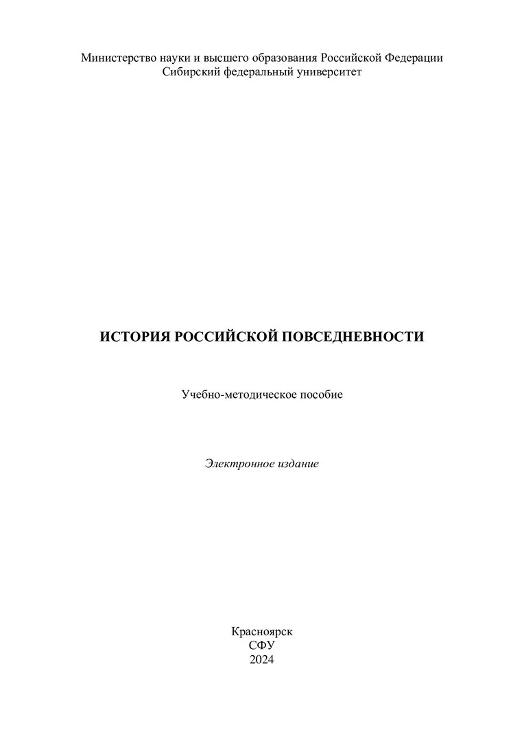 Библиографическое описание:История российской повседневности : учебно-методическое пособие / Сиб. федер. ун-т, Гуманитар. ин-т ; сост.: Г. М. Лущаева, А. В. Сабенина. - Электрон. текстовые дан. (pdf, 1,2 Мб). - Красноярск : СФУ, 2024 (2024-04-19). - 23 с. - Загл. с титул. экрана. - Изд. № 2024-21582 : Б. ц. - Текст : электронный.