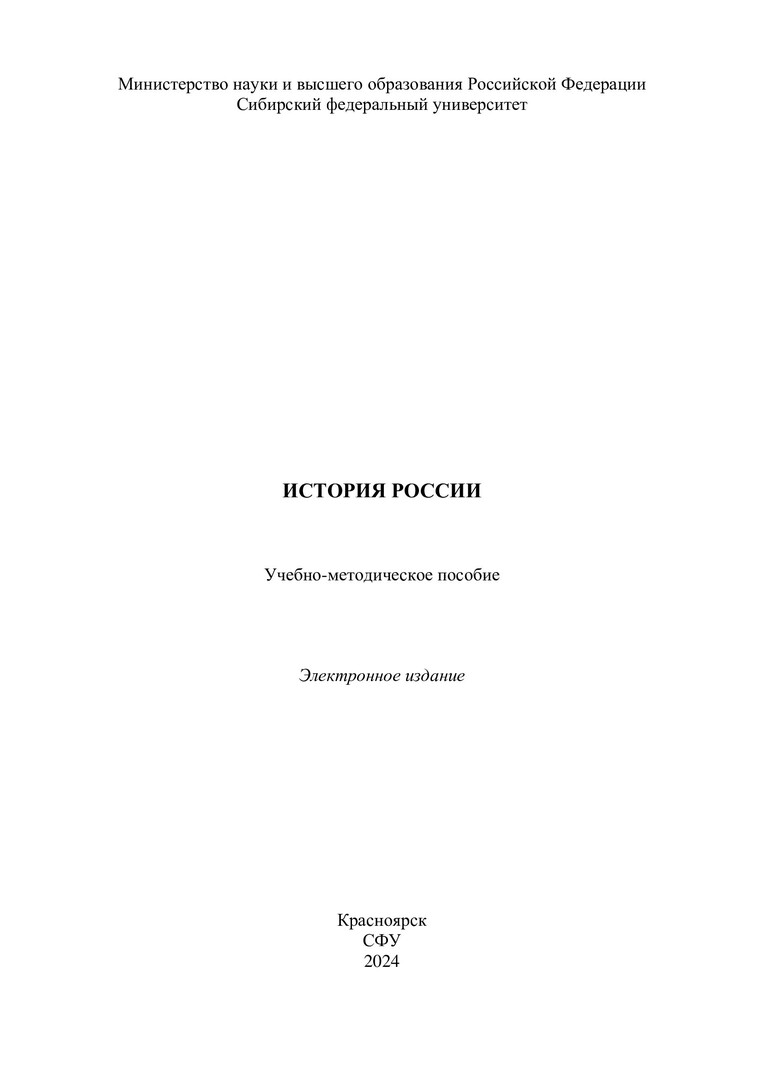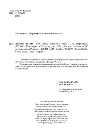 Библиографическое описание:История России : учебно-методическое пособие / Сиб. федер. ун-т, Гуманитар. ин-т ; сост. Л. Е. Мариненко. - Электрон. текстовые дан. (pdf, 0,8 Мб). - Красноярск : СФУ, 2024 (2024-04-19). - 12 с. - Загл. с титул. экрана. - Изд. № 2024-21581 : Б. ц. - Текст : электронный.
