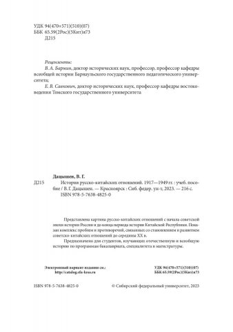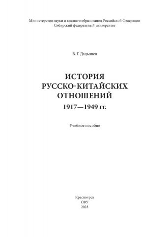 Библиографическое описание: Дацышен, Владимир Григорьевич. История русско-китайских отношений. 1917-1949 гг. : учебное пособие / В. Г. Дацышен ; рец.: В. А. Бармин, Е. В. Савкович ; Сибирский федеральный университет, Гуманитарный институт. - Электрон. текстовые дан. (1,9 Мб). - Красноярск : СФУ, 2023 (2023-08-31). - 216 с., 13.5 усл. печ. л. - Загл. с титул. экрана. - Электрон. версия печ. публикации . - Библиогр.: с. 205-216. - 100 экз. - ISBN 978-5-7638-4825-0 : Б. ц. - Изд. № 2023-18615. - Текст : электронный.