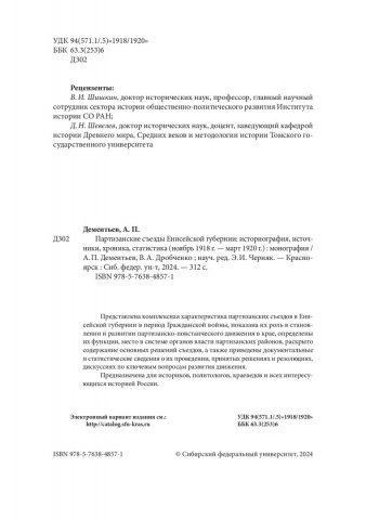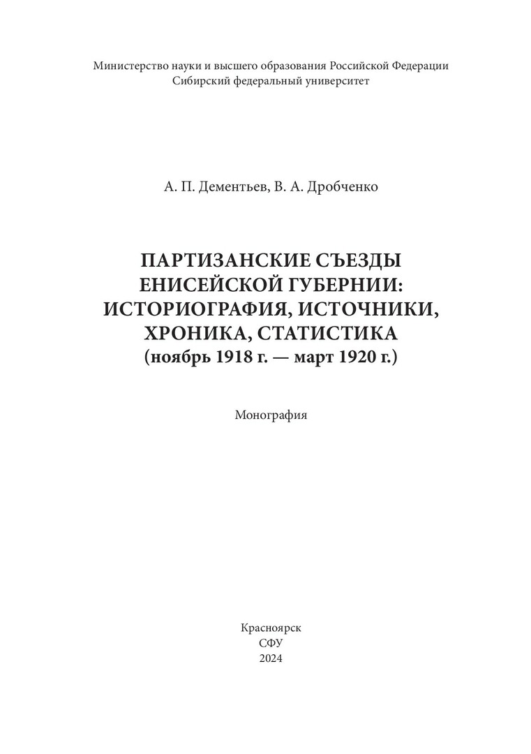 Библиографическое описание: Дементьев, Александр Петрович. Партизанские съезды Енисейской губернии: историография, источники, хроника, статистика (ноябрь 1918 г. - март 1920 г.) : монография / А. П. Дементьев, В. А. Дробченко ; рец.: В. И. Шишкин, Д. Н. Шевелев ; Сибирский федеральный университет, Гуманитарный институт. - Электрон. текстовые дан.(11,6 Мб). - Красноярск : СФУ, 2024 (2024-04-03). - 312 с., 19.5 усл. печ. л. : табл. - Загл. с титул. экрана. - Электрон. версия печ. публикации . - Библиогр.: с. 151-168. - 500 экз. - ISBN 978-5-7638-4857-1 : Б. ц. - Изд. № 2023-19361. - Текст : электронный.