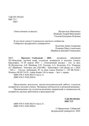 Библиографическое описание:Проспект Свободный - 2024 = Prospect svobodny - 2024 : материалы юбилейной XX Международной научной конференции студентов, аспирантов и молодых ученых. Красноярск, 15-20 апреля 2024 г.: в 4 частях / Министерство науки и высшего образования Российской Федерации, Сибирский федеральный университет; отв. за вып. М. Шухратзода [и др.]. - Электрон. текстовые дан. (37,5 Мб). - Красноярск : СФУ, 2024 . - Загл. с титул. экрана. - ISBN 978-5-7638-5020-8. - Текст : электронный. Ч. III. - 2024. - 845 с. - Библиогр. в конце ст. - ISBN 978-5-7638-5023-9 : Б. ц.