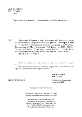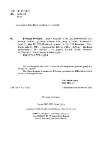 Библиографическое описание:Проспект Свободный - 2020 : материалы XVI Международной конференции студентов, аспирантов и молодых ученых, посвященной году памяти и славы (75-летию Победы в Великой Отечественной войне 1941–1945 годов). Красноярск, 6 апреля – 16 мая 2020 г. / Сиб. федер. ун-т ; отв. за вып. С. К. Франчук. - Электрон. текстовые дан. (pdf, 54,9 Мб). - Красноярск : СФУ, 2020 (2020-08-07). - 2098 с. - Загл. с титул. экрана. - ISBN 978-5-7638-4385-9 : Б. ц. - Изд. № 2020-11656. - Текст : электронный.