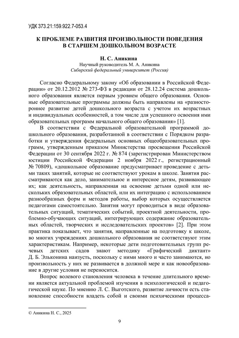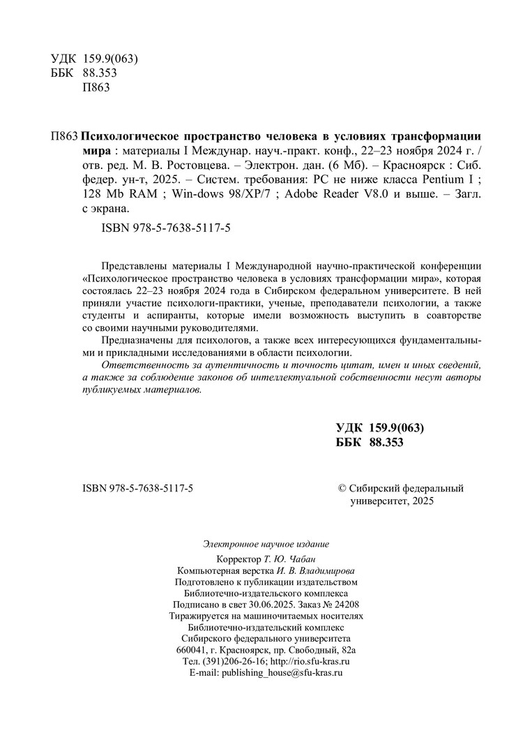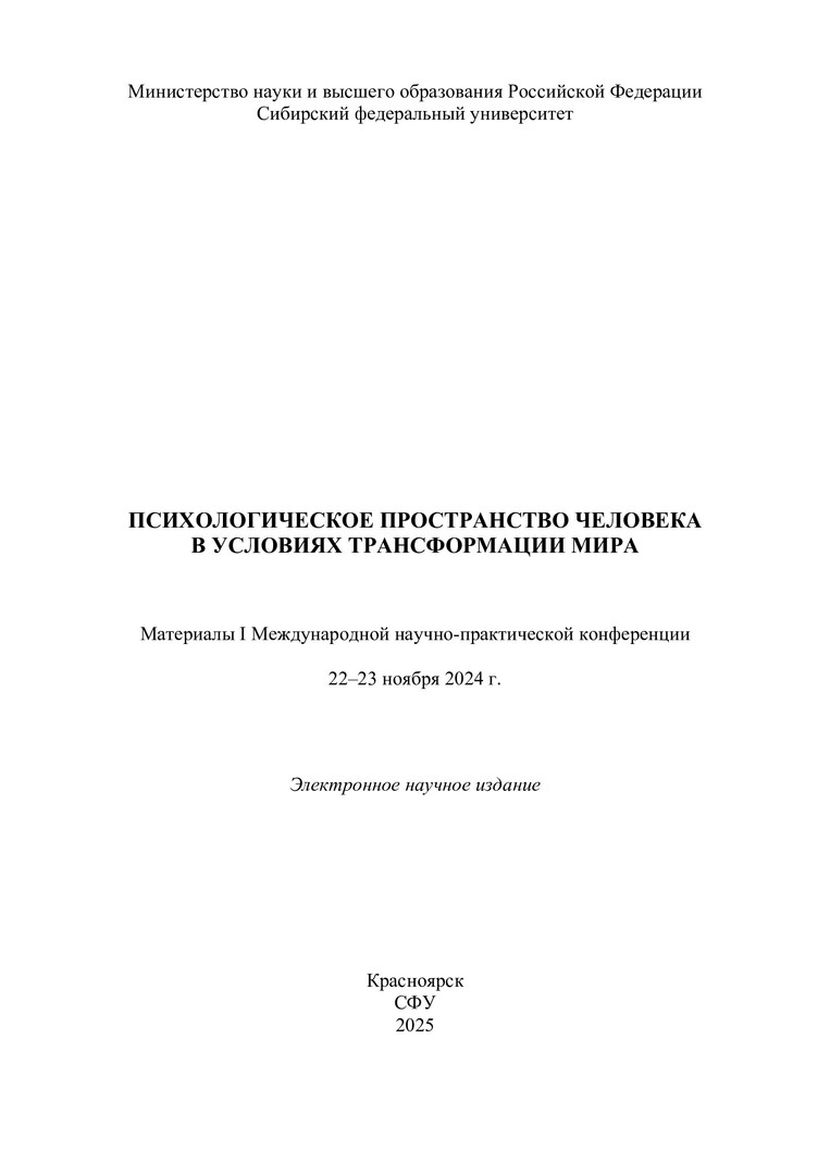 Библиографическое описание: Психологическое пространство человека в условиях трансформации мира : материалы I Международной научно-практической конференции, 22–23 ноября 2024 г. / Сибирский федеральный университет, Институт педагогики, психологии и социологии ; отв. ред. М. В. Ростовцева. - Электрон. текстовые дан. (pdf, 20,6 Мб). - Красноярск : СФУ, 2025 (2025-06-30). - 353 с. - Загл. с титул. экрана. - Библиогр. в конце ст. - ISBN 978-5-7638-5117-5 : Б. ц. - Изд. № 2025-24208. - Текст : электронный.