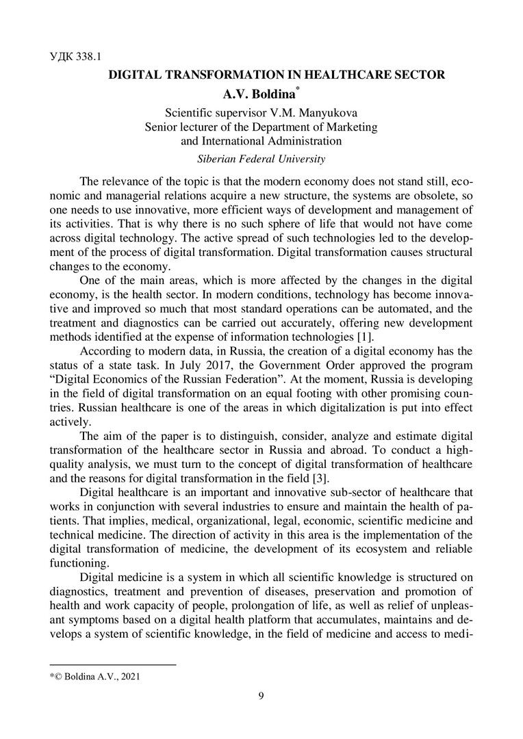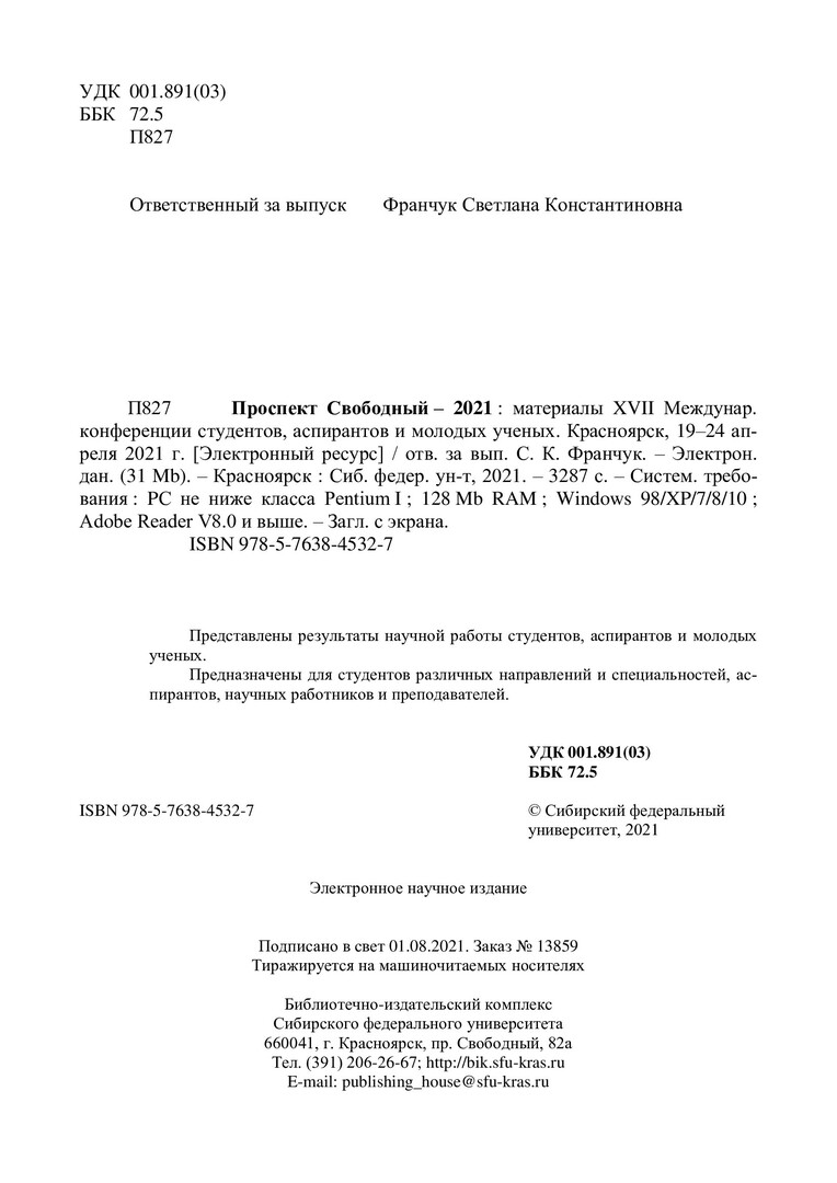 Библиографическое описание: Проспект Свободный - 2021 : материалы XVII Международной конференции студентов, аспирантов и молодых ученых. Красноярск, 19–24 апреля 2021 г. / Сибирский федеральный университет ; отв. за вып. С. К. Франчук. - Электрон. текстовые дан. (pdf, 73,7 Мб). - Красноярск : СФУ, 2021 (2021-08-01). - 3289 с., 401.5 усл. печ. л. : рис., табл. - Загл. с титул. экрана. - Библиогр. в конце ст. - ISBN 978-5-7638-4532-7 : Б. ц. - Изд. № 2021-13859. - Текст : электронный.