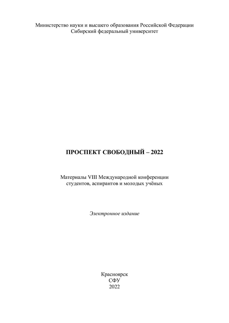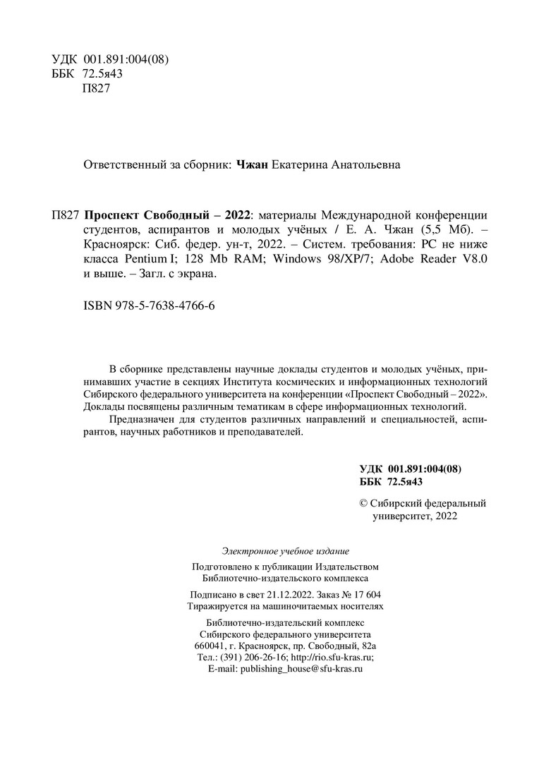 Библиографическое описание: Проспект Свободный - 2022 : материалы VIII Международной конференции студентов, аспирантов и молодых учёных / Сиб. федер. ун-т, Ин-т космич. и информ. технологий ; отв. за вып. Е. А. Чжан. - Электрон. текстовые дан. (pdf, 5,5 Мб). - Красноярск : СФУ, 2022 (2022-11-14). - 152 с. - Загл. с титул. экрана. - ISBN 978-5-7638-4766-6 : Б. ц. - Изд. № 2022-17604. - Текст : электронный.