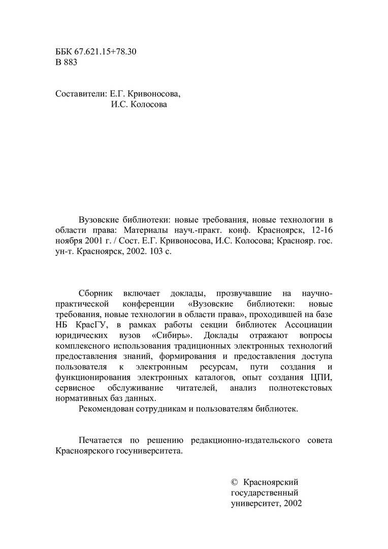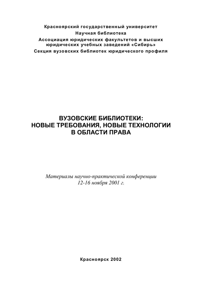 Авторский коллектив:Красноярский государственный университет, Научная библиотека (Красноярск); Ассоциация юридических факультетов и вузов "Сибирь". Секция вузовских библиотек юридического профиля"