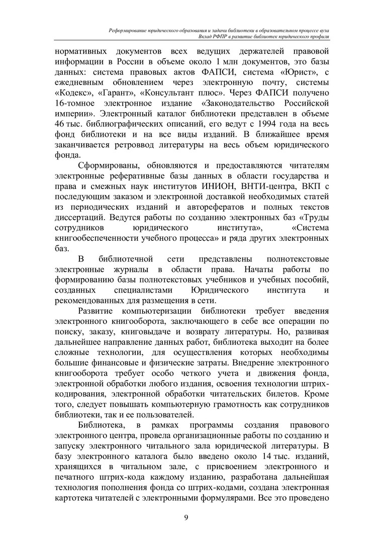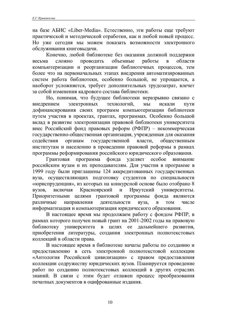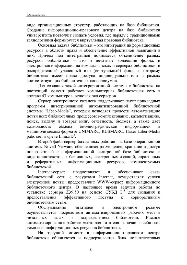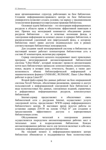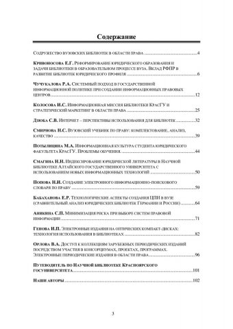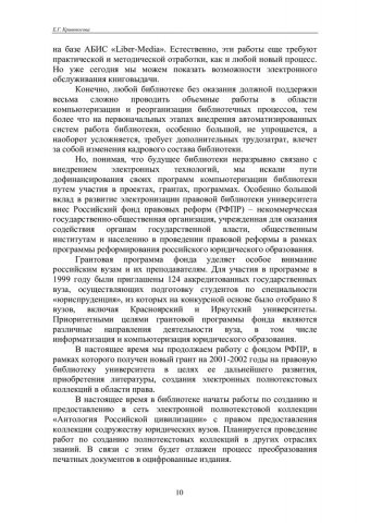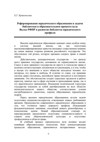 Аннотация:Сборник включает доклады, прозвучавшие на научно-практической конференции «Вузовские библиотеки: новые требования, новые технологии в области права», проходившей на базе НБ КрасГУ, в рамках работы секции библиотек Ассоциации юридических вузов «Сибирь». Доклады отражают вопросы комплексного использования традиционных электронных технологий предоставления знаний, формирования и предоставления доступа пользователя к электронным ресурсам, пути создания и функционирования электронных каталогов, опыт создания ЦПИ, сервисное обслуживание читателей, анализ полнотекстовых нормативных баз данных. Рекомендован сотрудникам и пользователям библиотек.