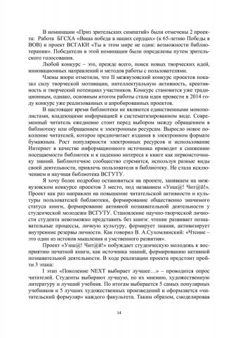 Аннотация:Сборник содержит материалы Всероссийской научно-практической конференции, проходившей 24–28 сентября 2012 г. в г. Красноярске, включает доклады участников, стендовые доклады, презентационные материалы участников конференции. Представляет интерес для специалистов библиотек всех систем и ведомств, преподавателей и студентов вузов.