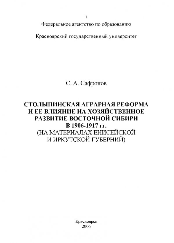 Столыпинская реформа и ее влияние на хозяйственного развитие Восточной Сибири в 1906-1917 гг. (на…